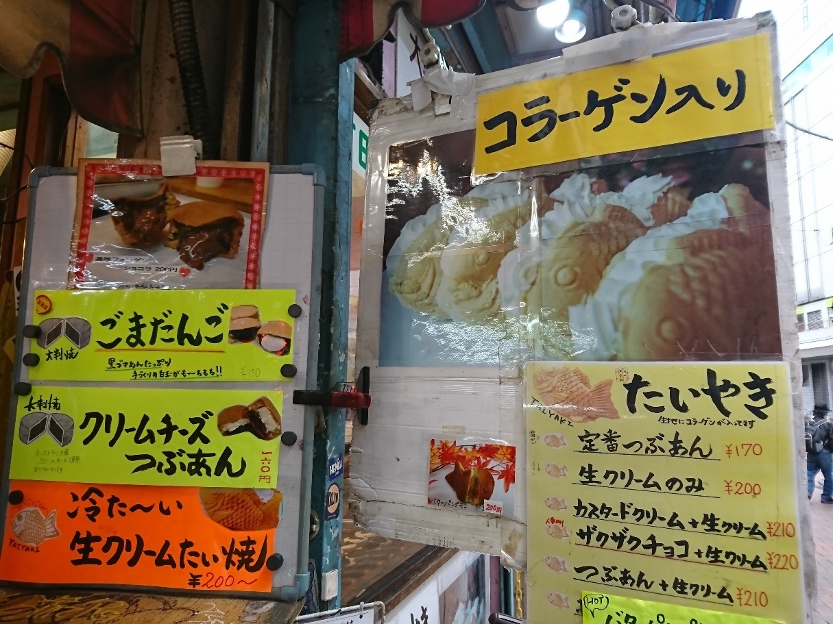 手作りのポップや商品説明が所狭しと店頭に貼られ、たくさんある種類にどれにするか迷ってしまいます。結局、一番大きく目立って宣伝していたコラーゲン入りたい焼きに。あふれんばかりの白いクリームにお得感があります。仲見世商店街の人気店の小籠包屋と向かい合っており、どちらの店もたくさんのお客さんが次々に訪れています。