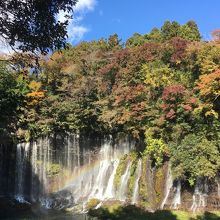 崖を流れ落ちる水のカーテンは、日本全国数多ある白糸の滝の中でも随一といえる迫力で、この日は晴天に恵まれたため、綺麗な虹が紅葉とともに彩を添えていました。