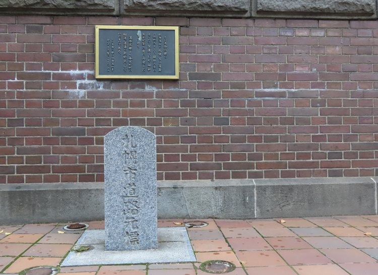 道庁赤れんが庁舎へ向かう東門の脇にぽつんとあります。1928年に置かれたもので、1982年に再建されました。札幌市の道路の起終点であることは、すなわち北海道の道路の起終点であると、当時の知事の筆跡で記されています。ただしその位置が北3条西6丁目なので、なぜ50年以上も失われていたのか謎は深まります。とはいえ、わざわざ出向かなくても赤れんが庁舎へ立ち寄ったときについでに確認できる場所なのはありがたいです。