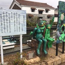 旧加茂川沿いにいくつかカッパの像があります。最初に気づいたのは「疎開先から帰ってきたカッパの家族」だそうです。カラフルかつユーモラスで通りにいろどりを添えています。カッパロードというネーミングは境港の人気名所、水木しげるロードに影響されたのでしょうか?