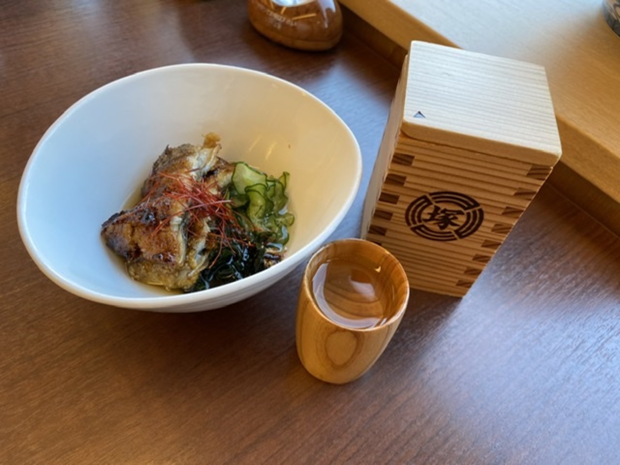 先ずはうざくに日本酒!日本酒の入れ物がお洒落です。