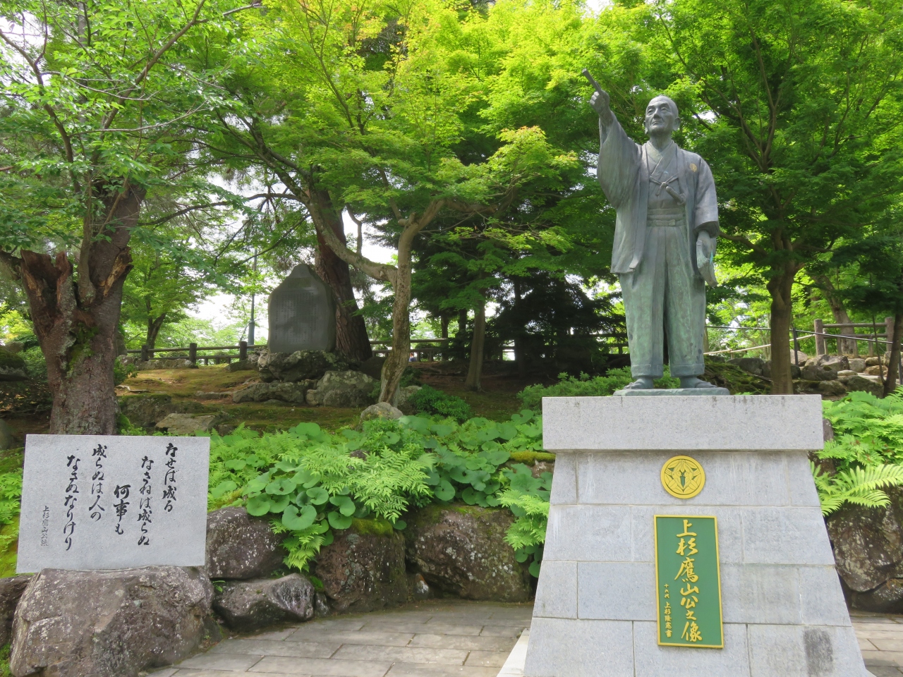 米沢藩の9代目の藩主で財政を建て直した人と聞いてもピンどこず、像の横に「為せばなる為さねばならぬ何事も」と。この名言を言った人だったのか。人は知らず言葉だけを知っていたので像を見て米沢の人だったことを知りました。