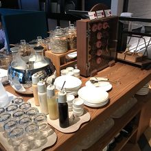 ビュッフェ台のメニューは多くはありませんが、シリアルのメニューがたくさんあったり、珍しいジュースが置いてあったりと満足できる内容でした。内装もお洒落なレストランです。