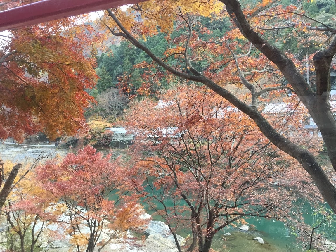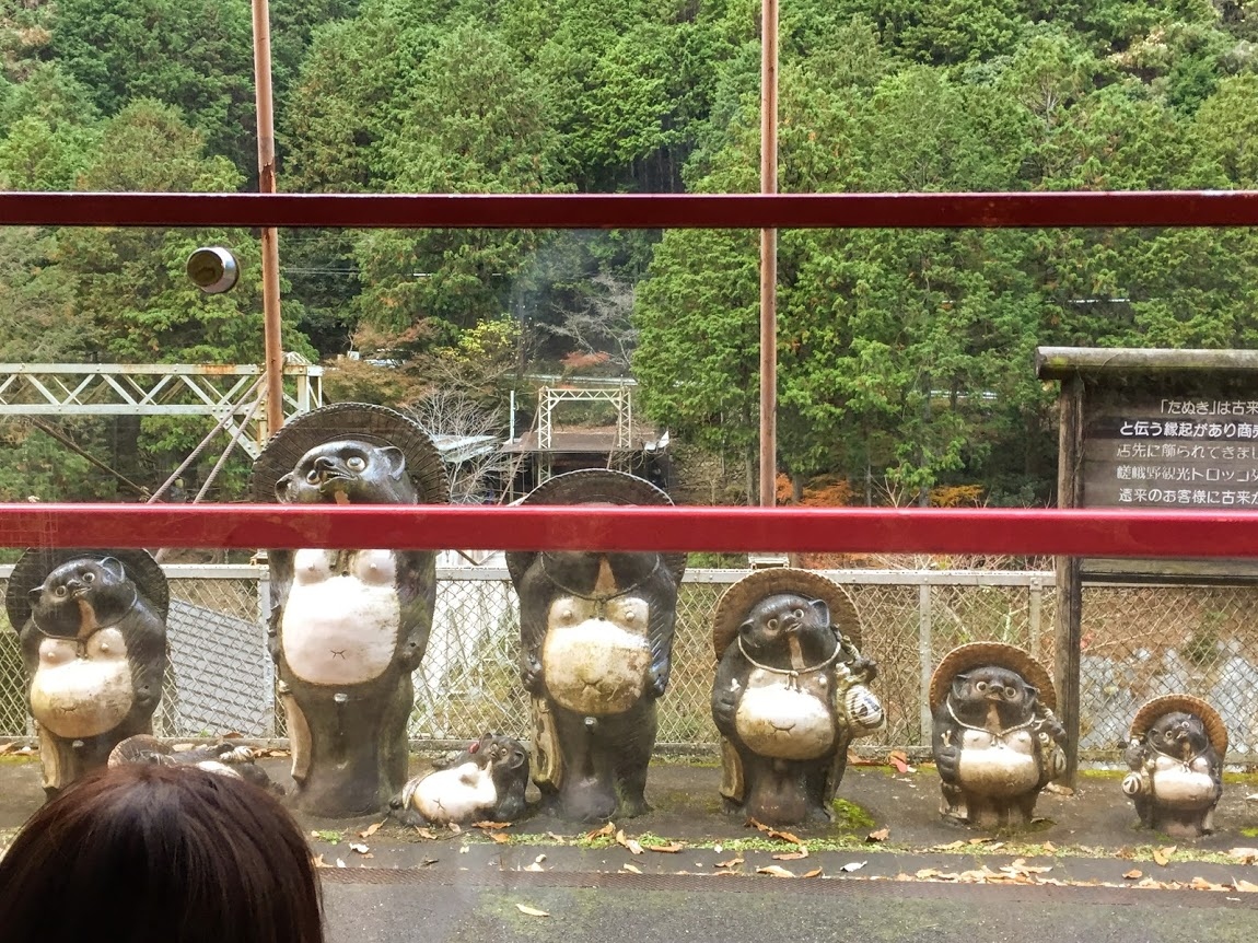 嵯峨野から亀岡までのやく7.3キロ、レトロな列車に乗って、保津川渓谷のギリギリ終わりかけの紅葉の景色を楽しみました。途中、保津川にかかるつり橋を渡ったところにある保津峡駅では、タヌキが並んでお迎えしてくれてほっこりしました。