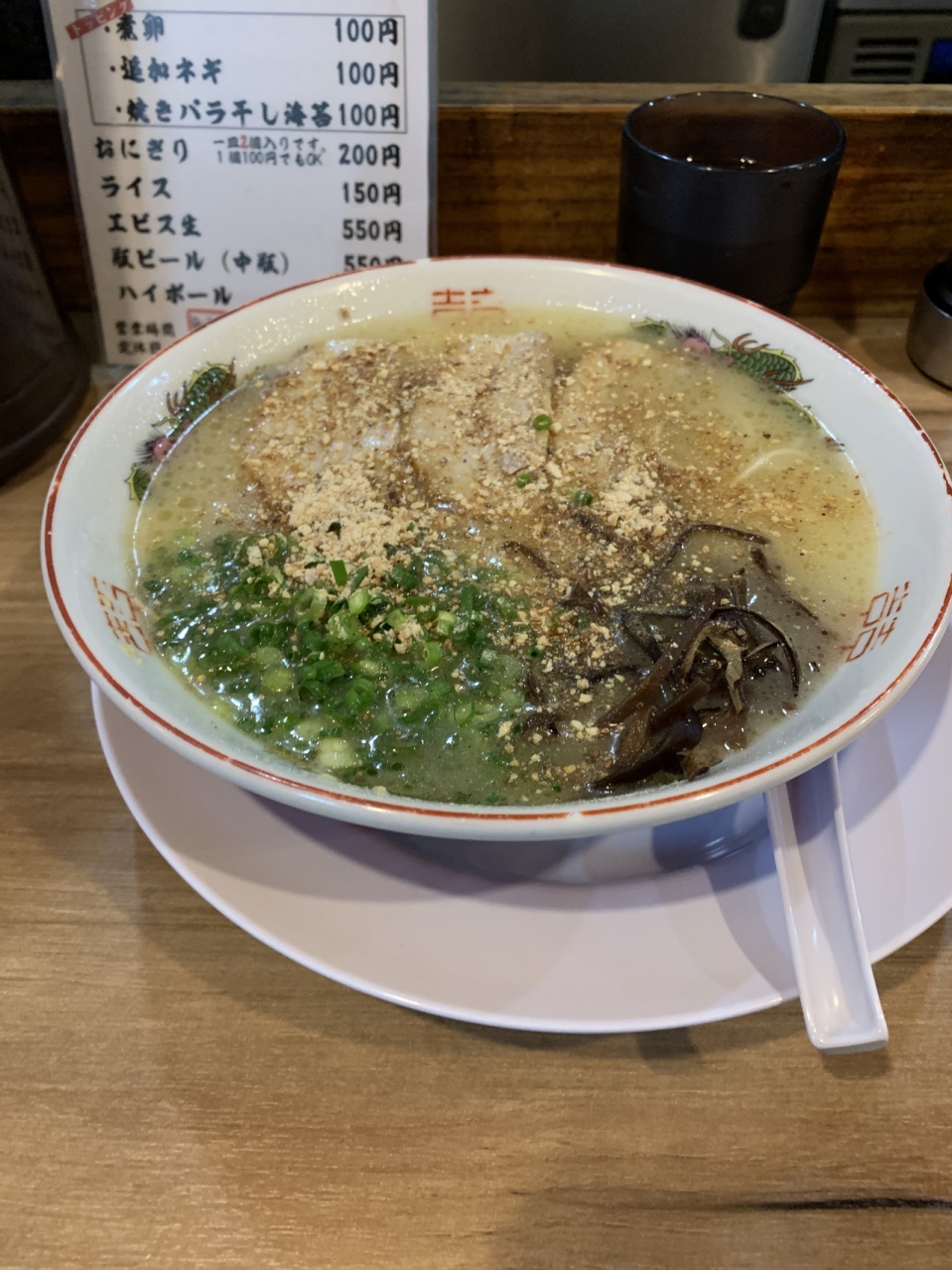 熊本訪問の時は必ず訪問している店。場所は鶴屋の裏手にひっそりとあるが、行列ができているのでわかりやすい。熊本ラーメンといえば薄いとんこつに揚げニンニクを入れて味を整えておる感じであるが