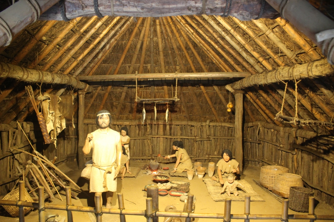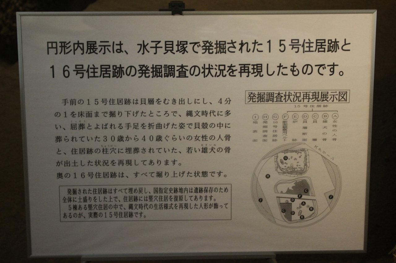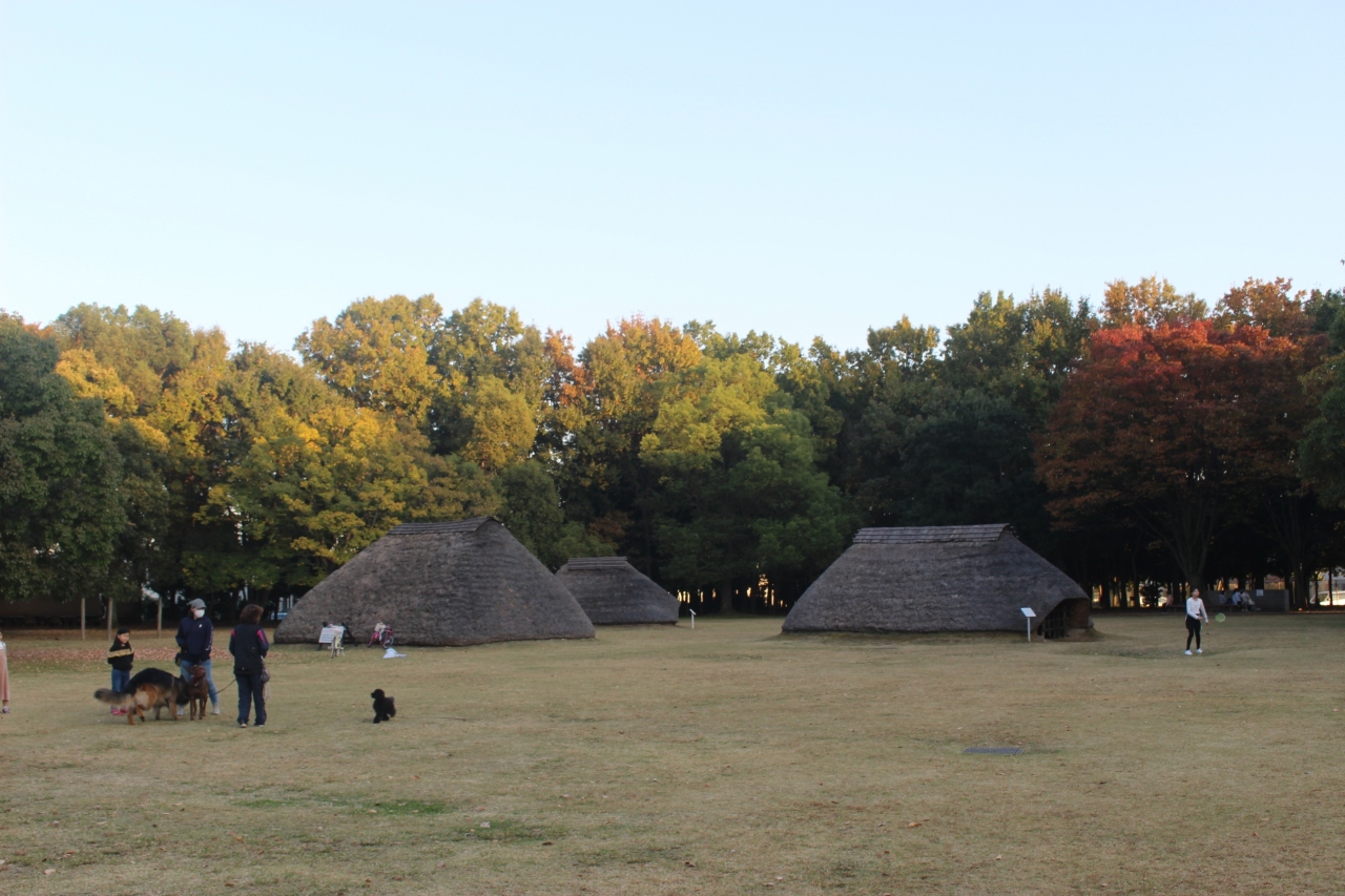 資料館には発掘された土器、展示館には発掘されたときの家のあと、屈葬で埋葬された女性の遺体のレプリカが展示され、公園には復元された竪穴式住居が何棟かありました。