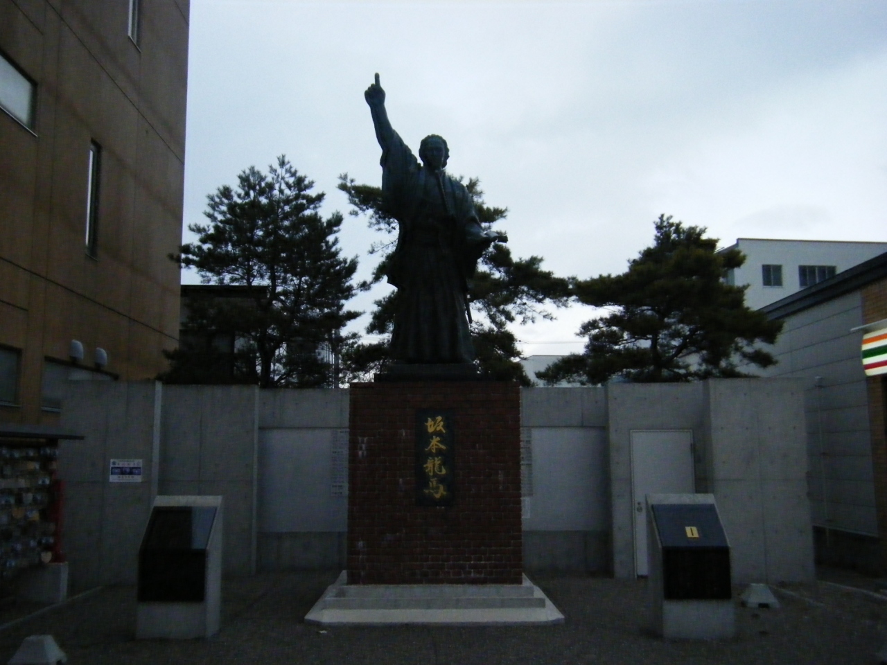 2020年1月に函館旅行をした際に立ち寄りました。函館市電「十字街」停留所から徒歩すぐ、十字街交差点のそばにあります。坂本龍馬が蝦夷地に足を運んだという記録はありませんが、坂本龍馬は蝦夷地を開拓したいという思いはあったようで、彼の意思を継いだ人たちが函館の発展に大きく寄与したとの事です。北海道で坂本龍馬の像を見ることになるとは思っておらずびっくりしました。