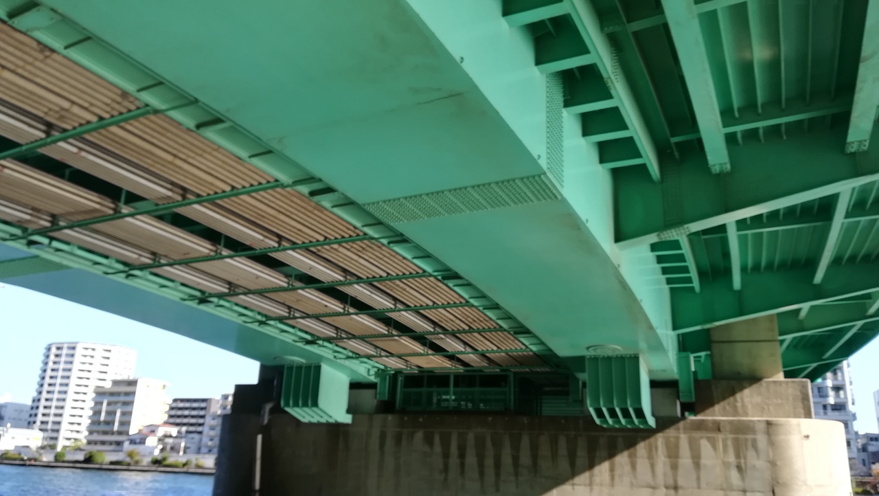 下の隅田川テラスを通り、隅田川大橋の下はやはり、ダブルの車の量ですから音が響きますね。