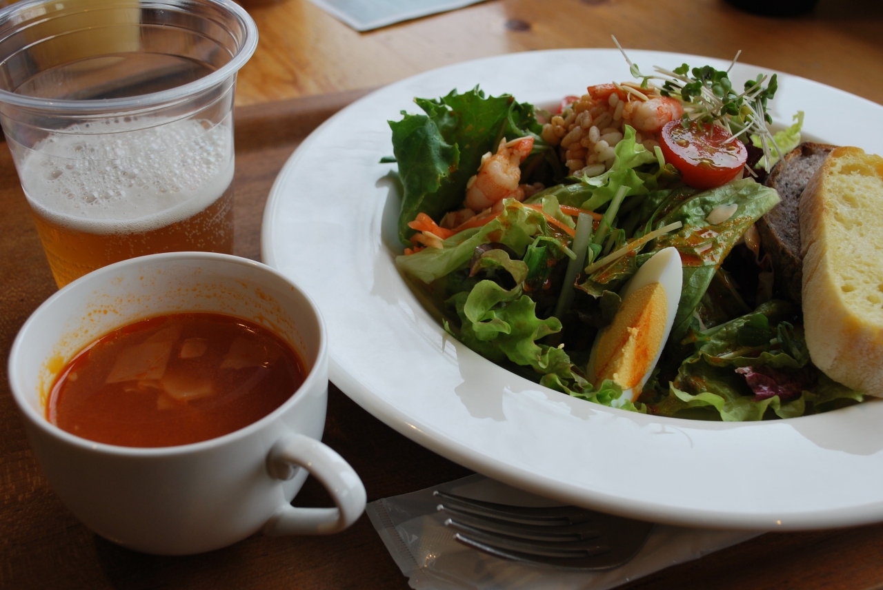テラス席でサラダランチセットをいただきました。新鮮なお野菜と自家製パン、ミネストローネの相性がとても良かったです。こちらのレストランはセルフサービスなので、店内の席だけでなく外のテーブルなどでも気軽に楽しめると思います。