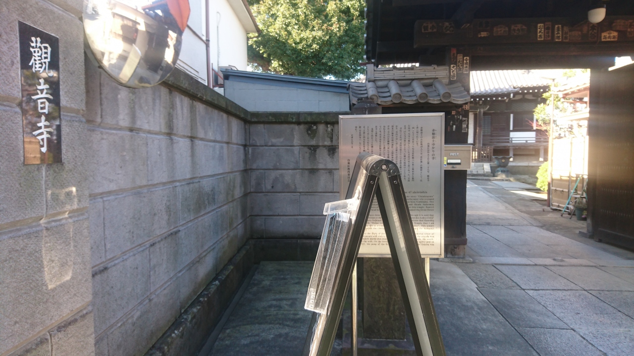 日暮里駅西側の寺院エリアにある新義真言宗の観音寺を訪れました。1680年に当地へ移転してきた寺院で、赤穂浪士討入りに名を連ねた近松勘六と奥田貞右衛門が観音寺和尚の兄弟であったことから、赤穂浪士討入りの会合にも使われていたそうです。寺内には赤穂浪士の供養塔もあるそうです。
