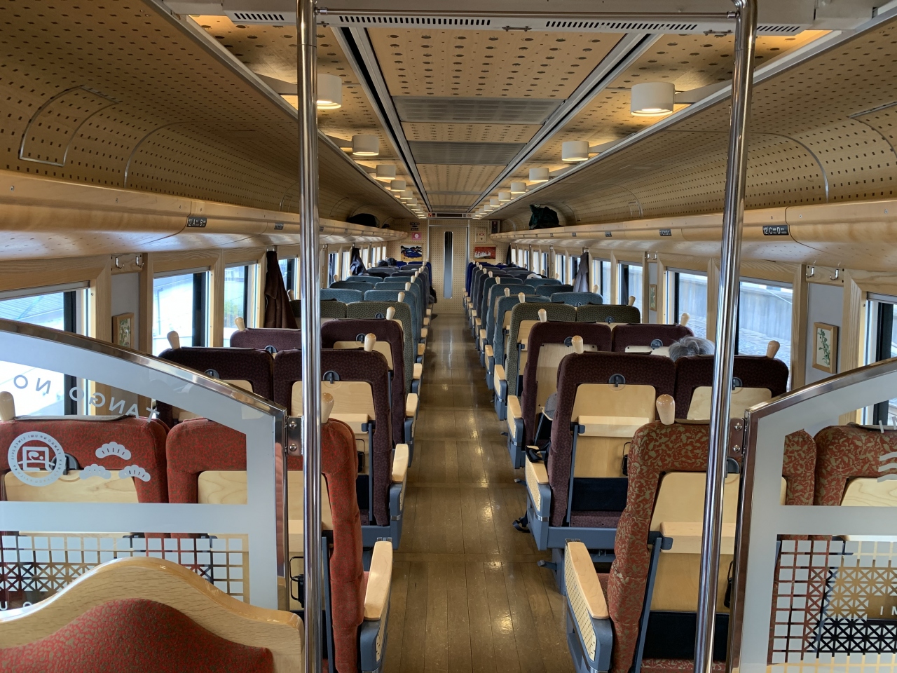 自由席を利用する予定でしたが、念のため1時間前にJRの空席案内で指定席の状況を見てみると残り10席ほどに。自由席も混雑するだろうなぁ、、、と思っていると、意外にもドア前で待っている人が少なく、ゆったりと座れました。15人弱のお客さんがおられました。