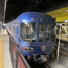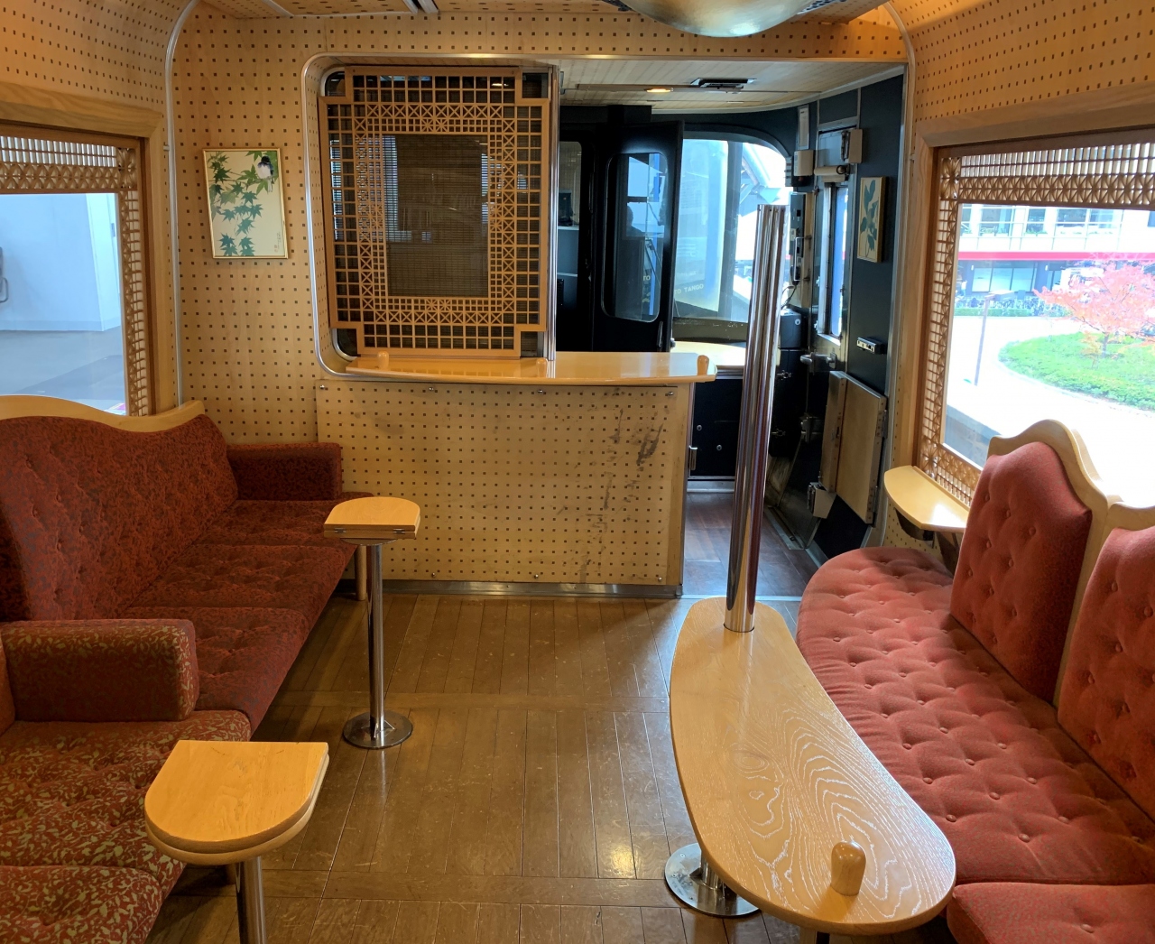 車両は藍色がベースとなっていて、外見だけでも高級感が漂います。内装も至る所に木目調のボードみたいな安っぽいものではないきちんとした木材が使われていて、車内全体の空気感が柔らかくなっていました。窓側にあるコート掛けの下には雰囲気に合わせたはがき大の絵画が掛けられており、細かい所にまでこだわりを感じます。車両後部(運転台側)はフリースペースで、横向きのソファが向かい合わせで置いてあります。乗車されている他の方もよく利用されていました。