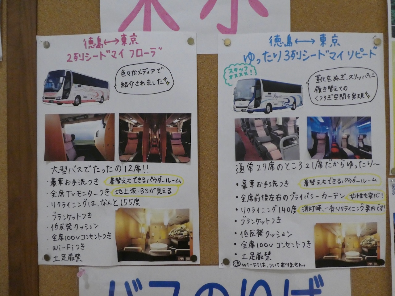 東京バスタ新宿から徳島駅前まで「マイリピート」を利用。「マイフローラ」は全席個室ですが、このマイリピートは3列シート。