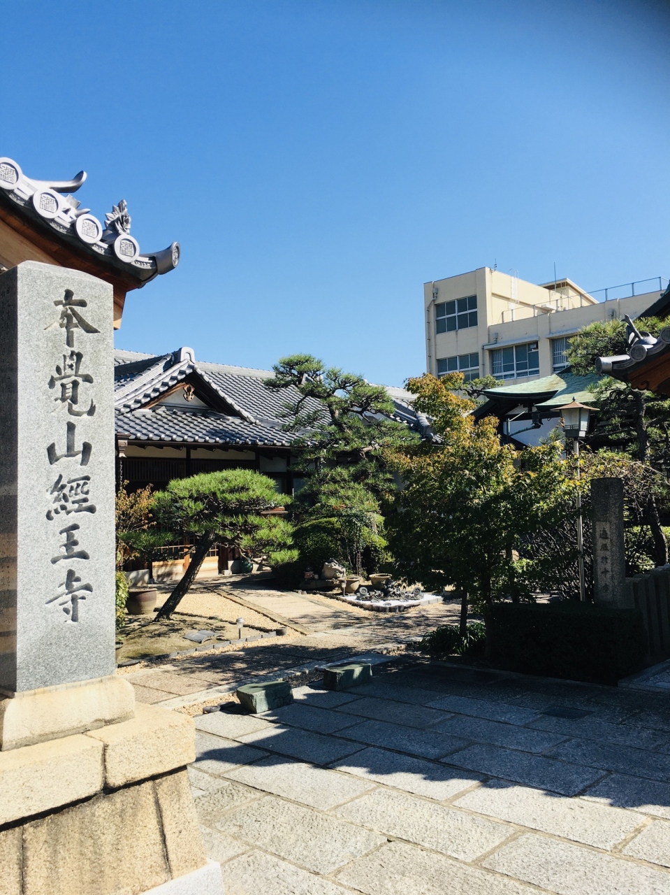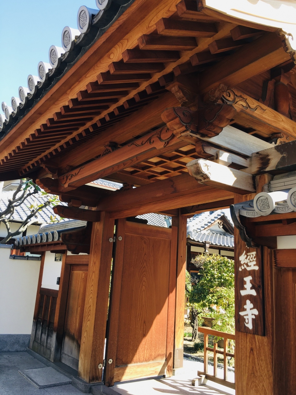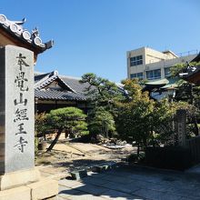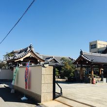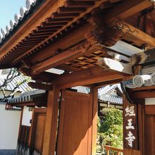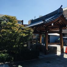 山門が木の温もりを感じられる瓦屋根でした。門の前には柵でがあり入れませんでしたが右横から境内に入ることが出来ます。本殿は素朴な建物で前面は庭のようになり松がいくつかあり垂直ではなく斜めに伸びていました。