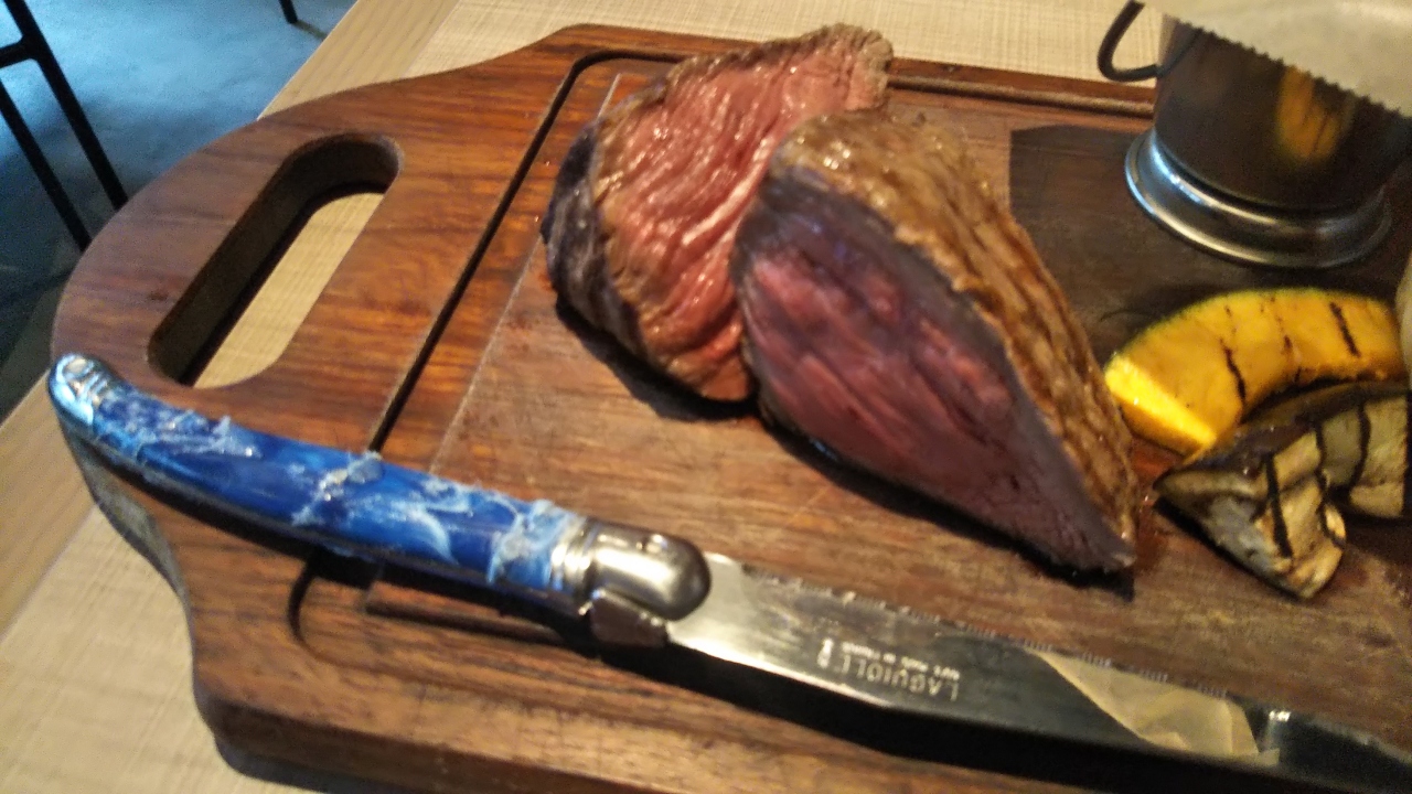ステーキは希少性が高いイチボ(背中とお尻の間)で、自分の過去イメージからすると、やや脂身系でとろけるような食感だったのですが、う~ん肉という感じでした。まぁちょっと好みとは違う感じでした。岩塩で食べると美味しかったですね。