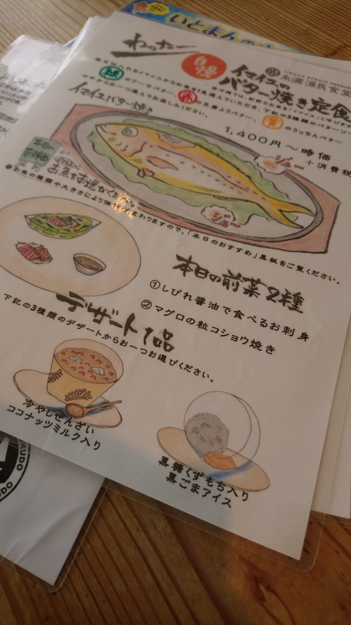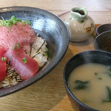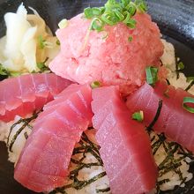 沖縄の糸満市の道の駅やお魚センターで買い物をした後に寄った食堂です。大人気のお店でm、並ぶこと30分、やっと中に入れました。しかし、お目当ての「イマイユのバター焼き」は、売り切れでした。残念でしたが、マグロ・ネギトロ二色丼を注文しました。熱く切られたマグロがとてもおいしく、ネギトロと味比べができました。雰囲気も良く、おいしい魚がいただけました。