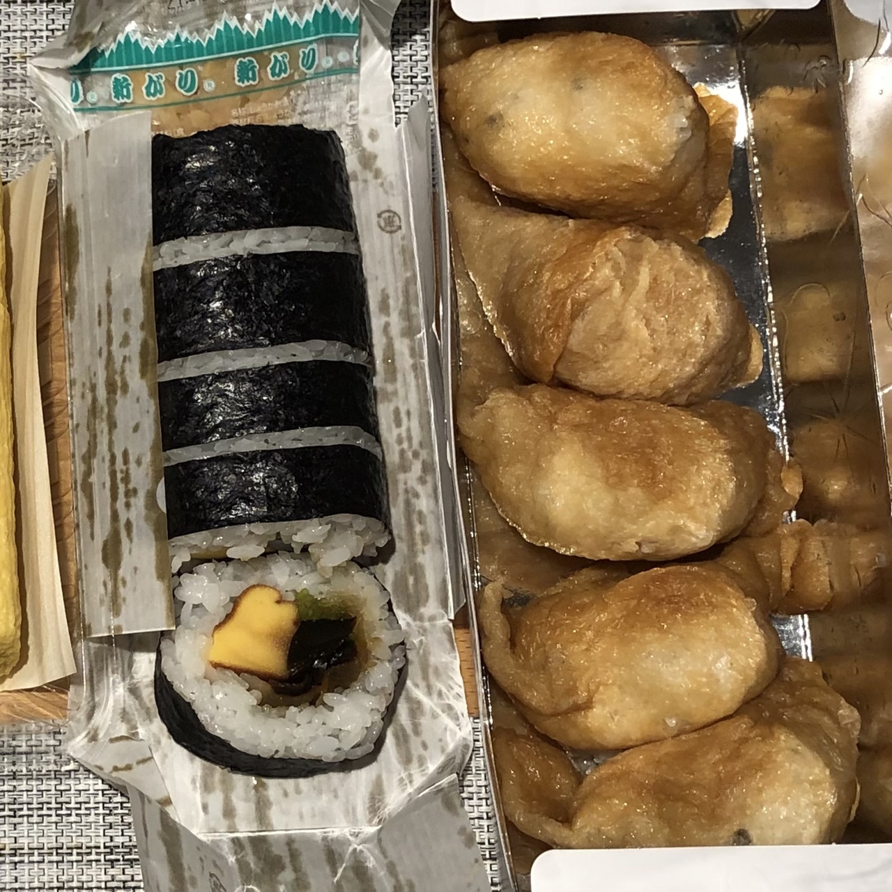 通常のお稲荷さんと太巻き寿司を頼んだのですが、夜にいただいたせいか太巻きは海苔が縮みシャリがゴワッとしていて、具がおいしいだけに非常に残念な状態。