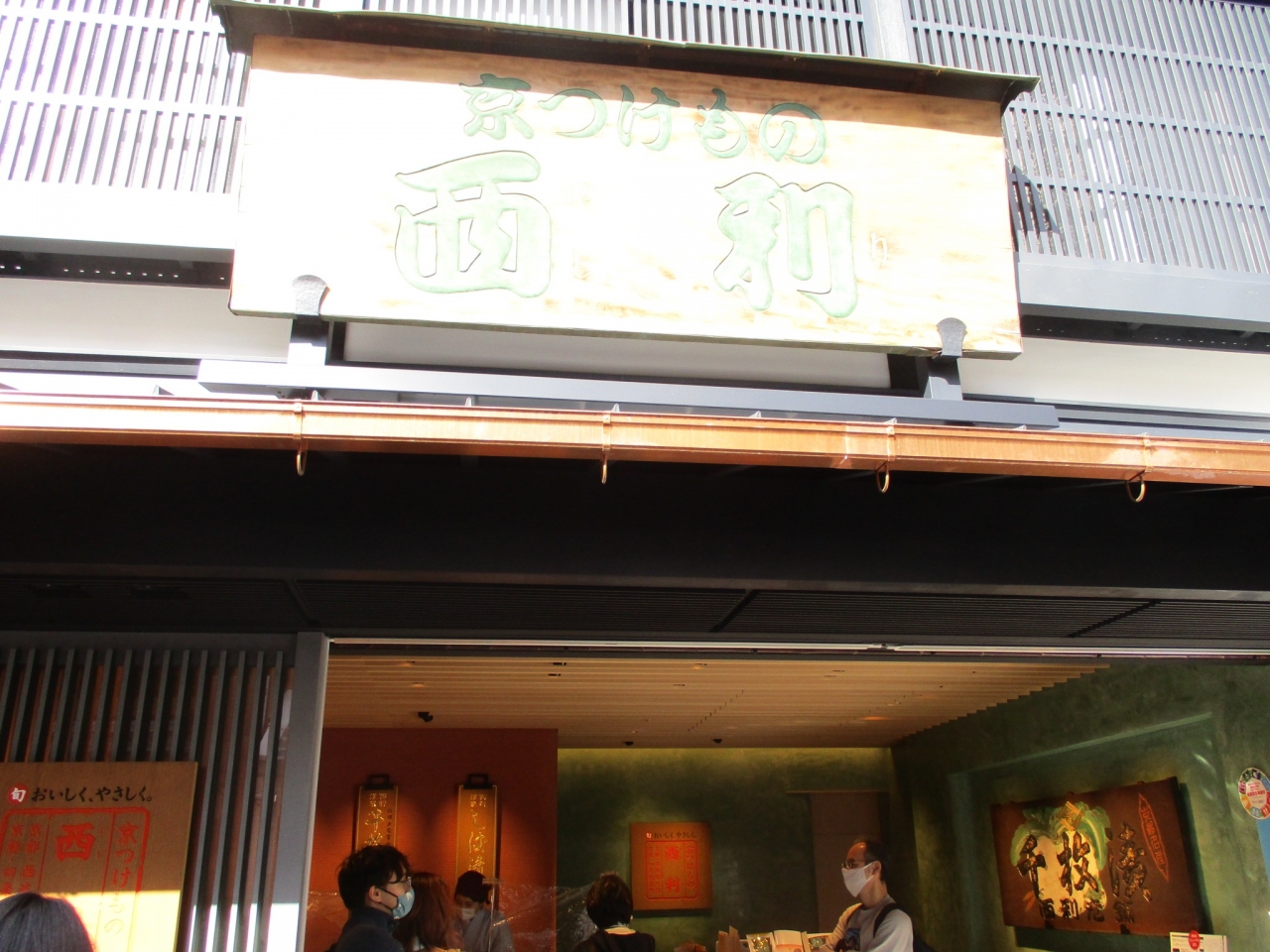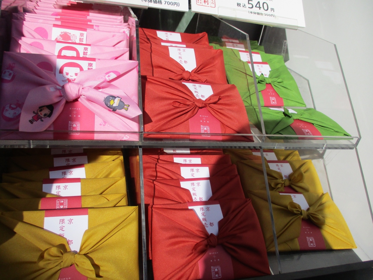 お漬物の老舗の「西利」。京都のあちこちにお店があります。清水寺など観光客の多いところにくると、ついつられて買いたくなります。季節の模様入りパッケージや、カラフルなミニふろしきに包まれたお漬物など、自宅用にもおみやげにもぴったりです。