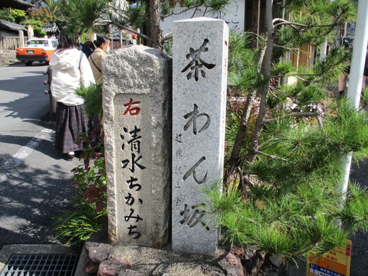 バス停「五条坂」を降りて清水寺方面に向かって坂を上っていくと、途中で五条坂と清水新道(茶わん坂)に分かれます。石標があります。どちらからでも行けますし途中で両坂を結ぶ道もあります。清水新道は清水焼のお店が並ぶ有名な遠りです。こちらは落ち着いて閑静な雰囲気です。