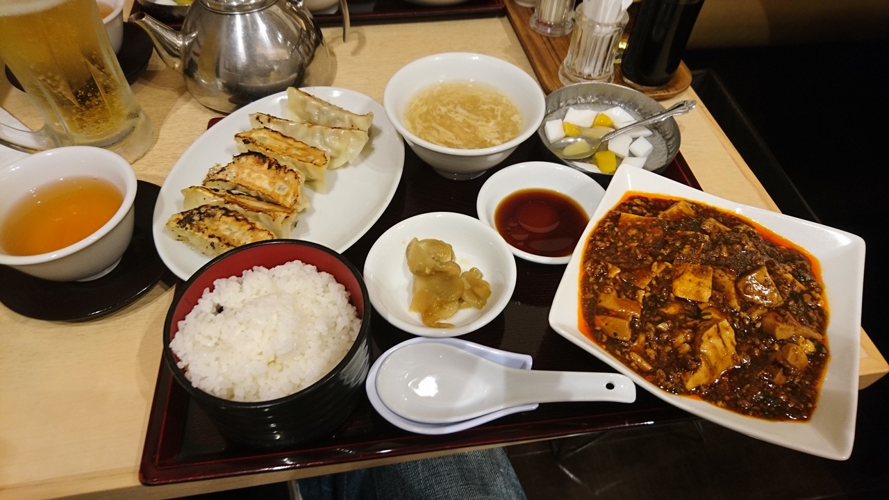 陳麻婆豆腐定食1250円を頂きましが、麻婆豆腐、餃子、スープ、ザーサイ、デザート、おかわり自由のご飯とボリューム満点です。
