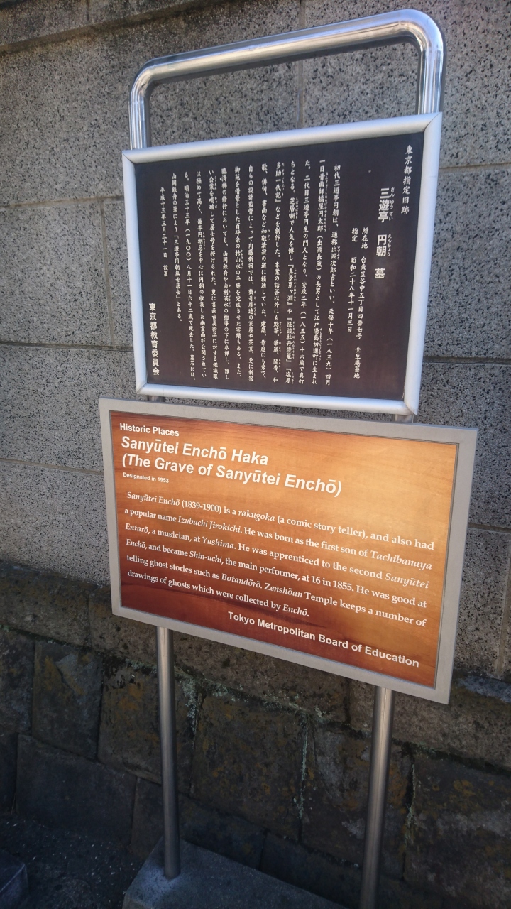 台東区谷中の三崎坂の途中にある全生庵を通りかかった際に、ここに葬られた方の説明板がありました。江戸開城の功労者として知られる山岡鉄舟と幕末から明治にかけて活躍した初代三遊亭円朝のお墓があるそうです。円朝は落語中興の祖で、そのお墓がここにあるとは知りませんでした。
