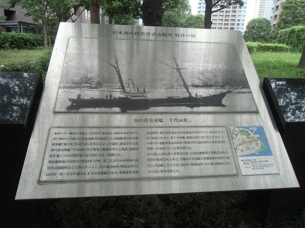 説明板によると、この地は嘉永6年(1853)幕府の命を受けた水戸藩が石川島造船所を創設した場所です。