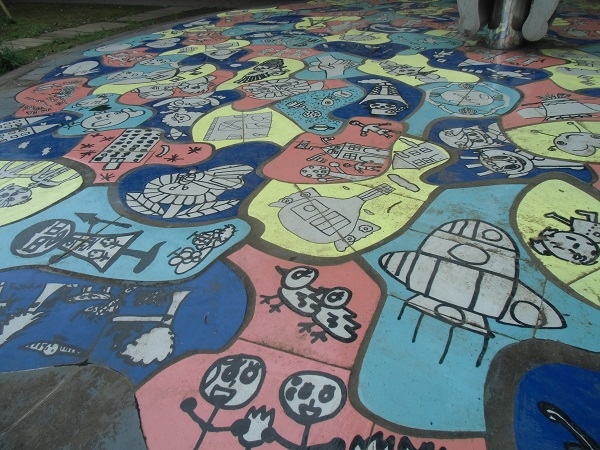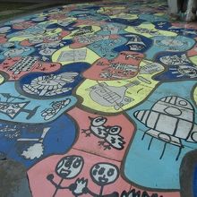 ゲートの下の地面には、おそらく子どもの描いた絵をちりばめたであろうアート作品になっています。