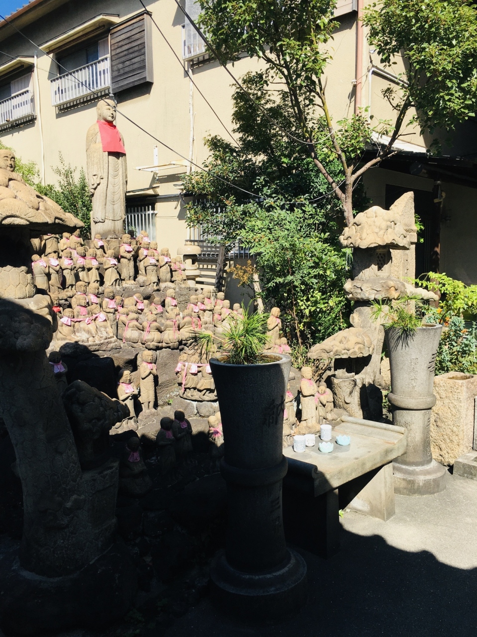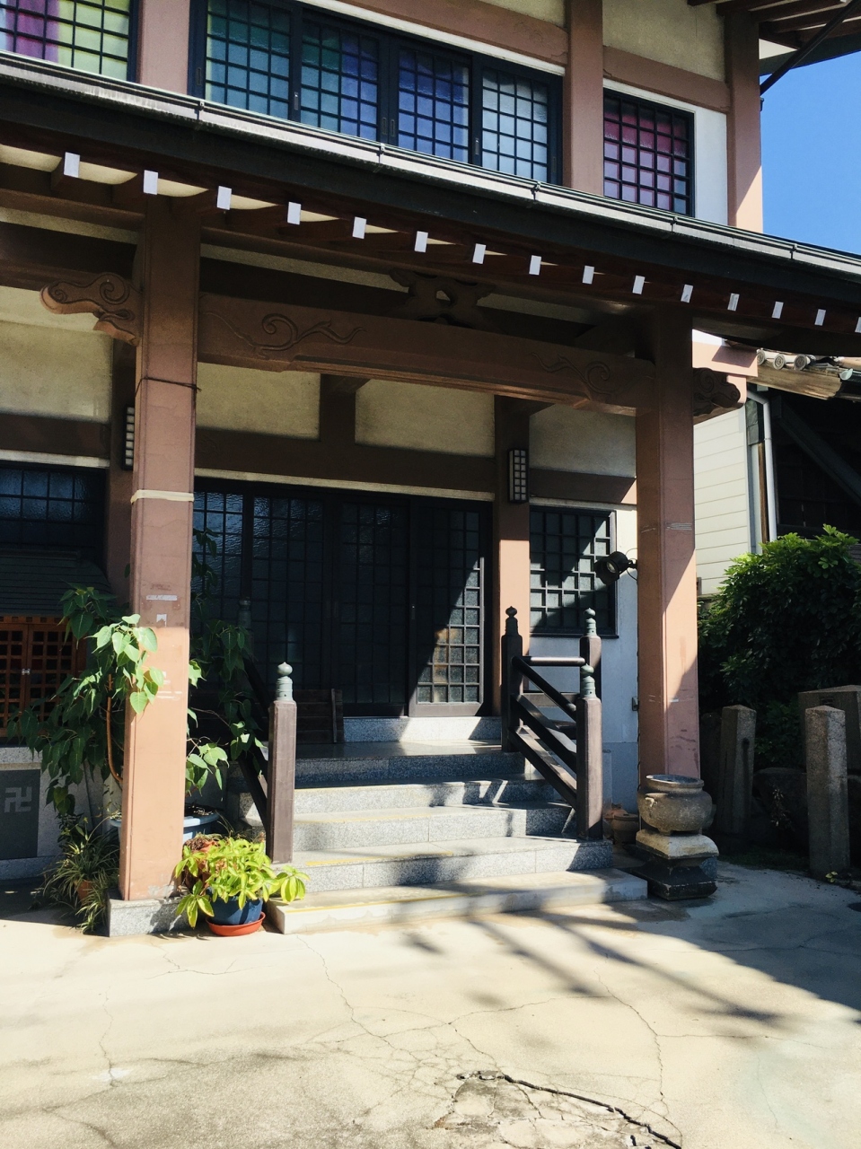 道路との境は塀になっていて山門は瓦屋根で目立っていました。本堂は2階建てで鉄筋コンクリートぽく寺らしくない建物でした。境内には固まった場所にたくさんのお地蔵様があり、それぞれ表情が異なっていて、大きなお地蔵が一つあります。