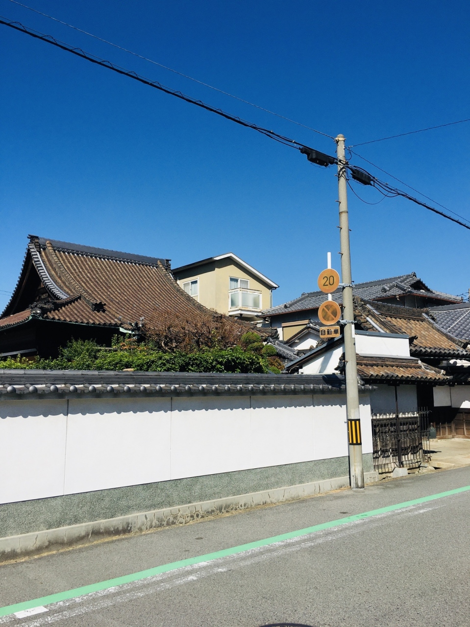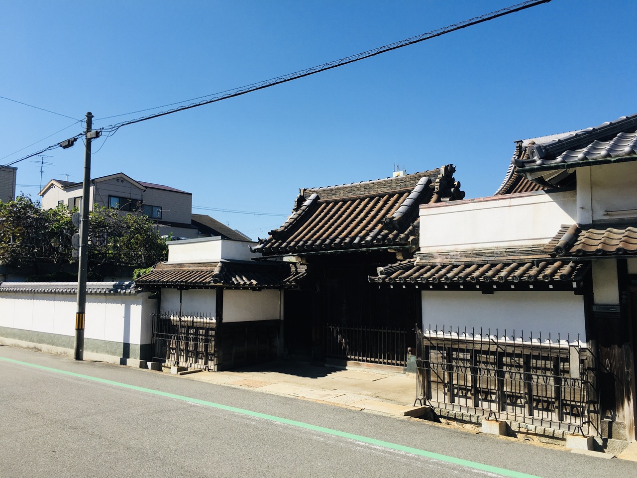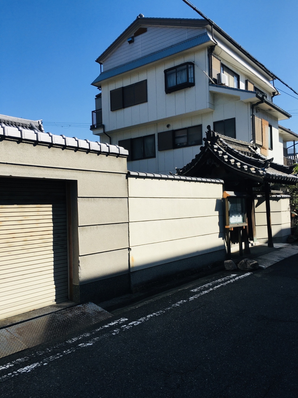白い壁は透き通ったように綺麗でしたが、他は昔のままのようで年季が入っていました。山門の横には電信柱が建っていて門は閉まっていました。観光寺院ではないので境内には入れませんでしが本堂の大きな屋根が外から見えました。