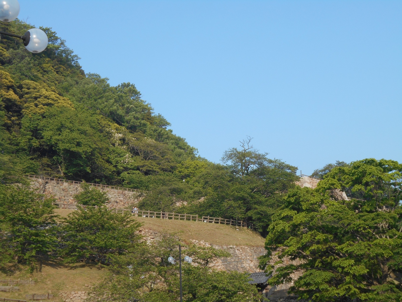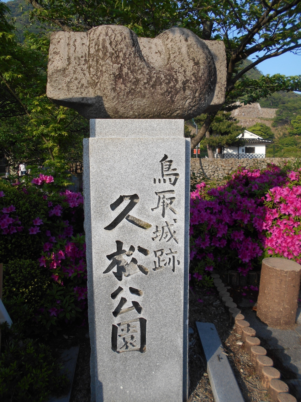 久松山に山名氏が築いた城で鳥取藩主池田光政が整備、改築したそうです。天守跡や二の丸跡が残っていますが、何と言っても石垣を補強するための巻石垣(天球丸)は初めて見る形の石垣で印象的です。また、久松公園は鳥取城跡の周辺を公園として整備した都市公園です。4月に200本以上のソメイヨシノを始めとする桜が開花する花見どころです。4月下旬に訪れたので葉桜でしたが、内堀の水辺に咲く様子を想像できました。