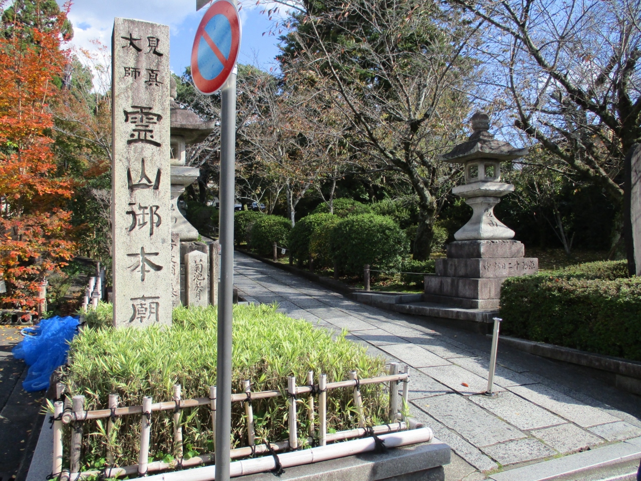 三年坂~二年坂を歩いている時に右側に霊山本廟がありました。親鸞聖人の御廟です。石畳のゆるやかな坂の参道が東に延びています。両側には木々があり、一部は少し紅葉がはじまっていました。お店が立ち並ぶ中に突然御廟があるのが印象的でした。