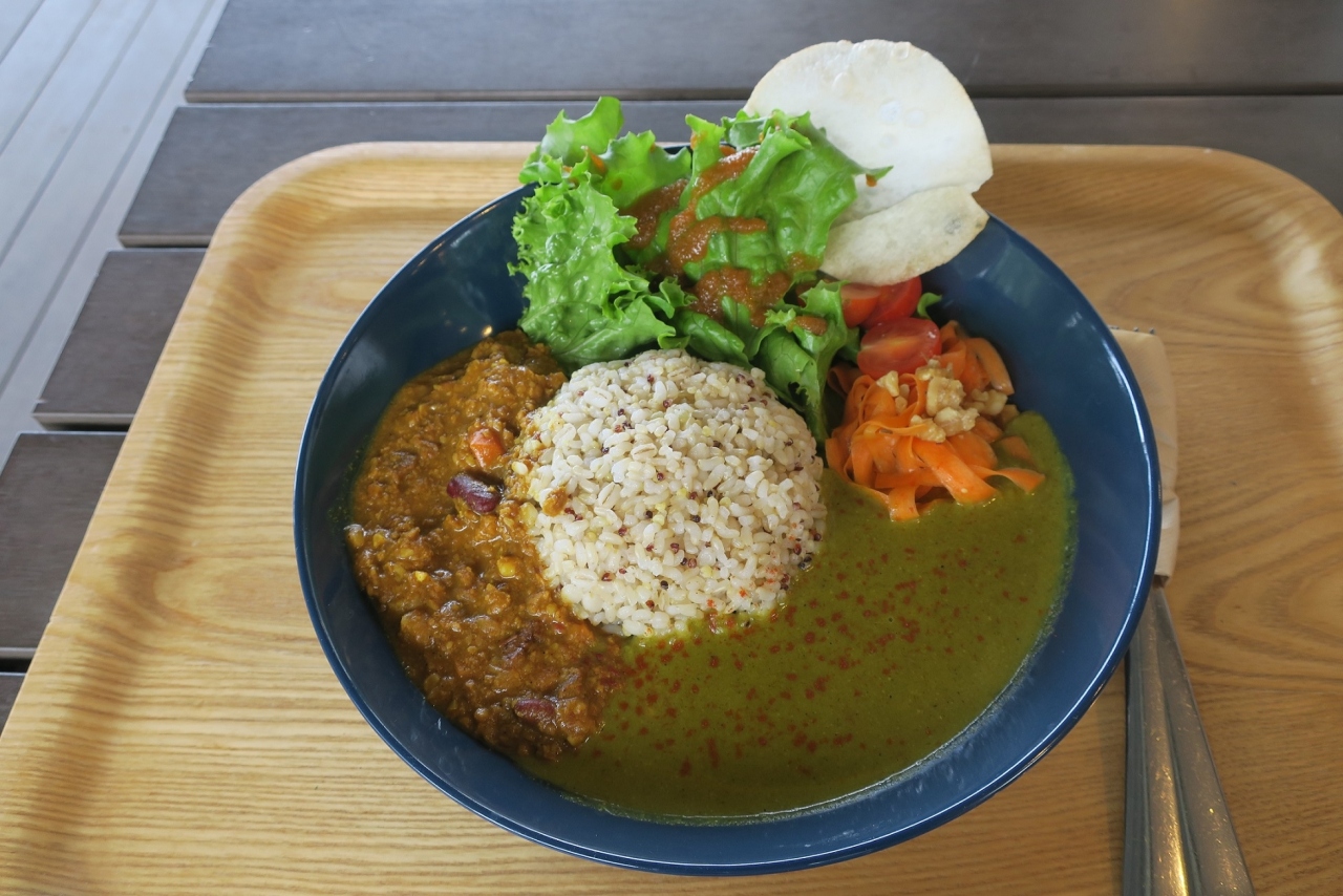 今回はダブルベジカレーをいただきました。グリーンカレーとキーマカレーの2種盛り。グリーンカレーと聞くと、タイのスパイシーなカレーを想像するけど、こちらはココナッツミルク、カシューナッツ入りでマイルドなお味。一方、キーマカレーは程よくスパイシー。ベジカレーだけに、挽肉に代わりにソイミートと高野豆腐。そして、くるみが入って、カリコリ食感。お豆さんもいて、食べ応えがあり、美味しかったです。