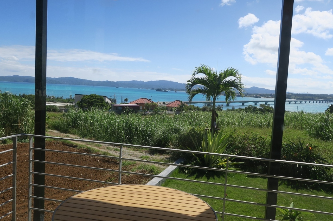 古宇利大橋と海を一望する眺めのよいカフェ。店内は、どの席に座っても、海が眺められる配置になっていました。