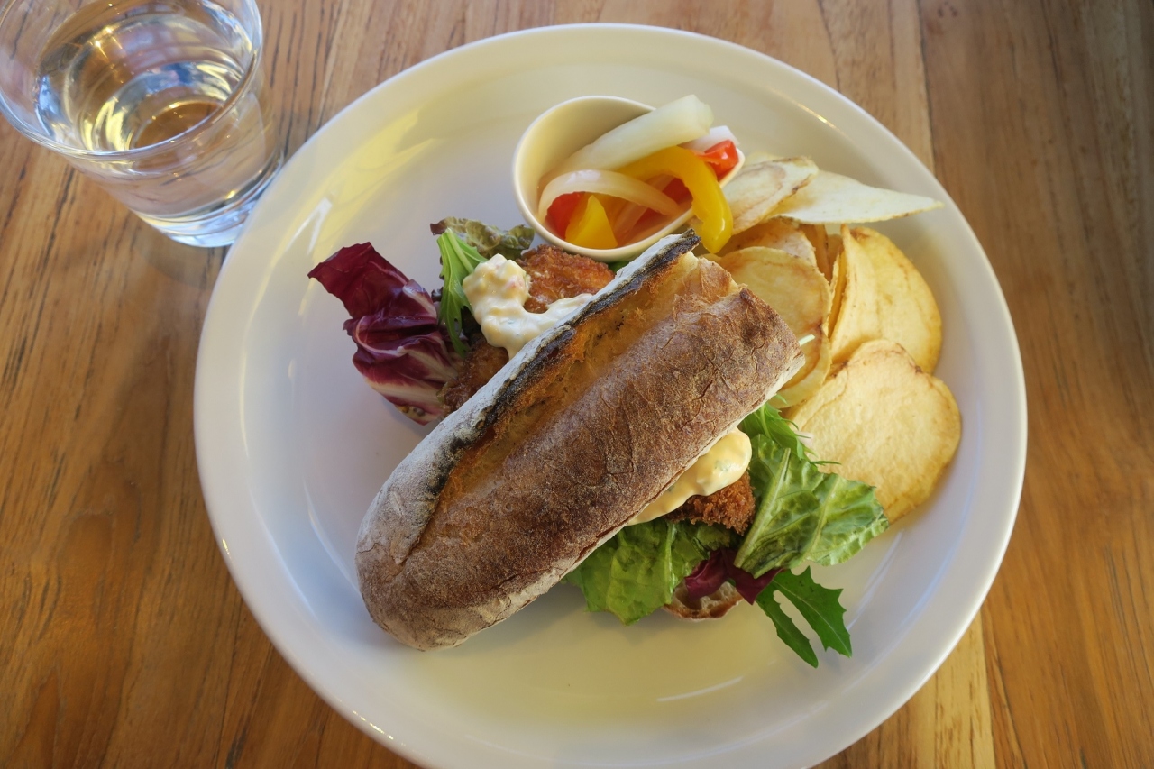 フィッシュサンドをいただきました。バゲットに、白身魚(鯛の一種)のフライとベビーリーフに、マスタードとタルタルっぽいソースがサンド。サンドイッチの形状でかぶりつけば、固いパンがなかなか噛み切れなくて、フライがぺったんこにベチャッと崩れてしまう。かと言って、ナイフで切ろうにも切れないから、結局別々にしてパンを手でちぎり、魚を切って食べました。オープンサンドっぽくしてもずり落ちるし。なかなかの難関ゲーム:)
