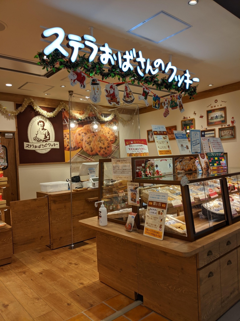 JR市川駅(改札外)の商業施設(シャポー市川)にある「ステラおばさんのクッキー」です。チョコチップ、キャラメルカスタード、コーンフレークなどクッキーの種類は充実していました。クッキーは量り売りでも買うことができるので1枚からでもOKです。どのクッキーもバターの香りが濃厚で美味しかったです。