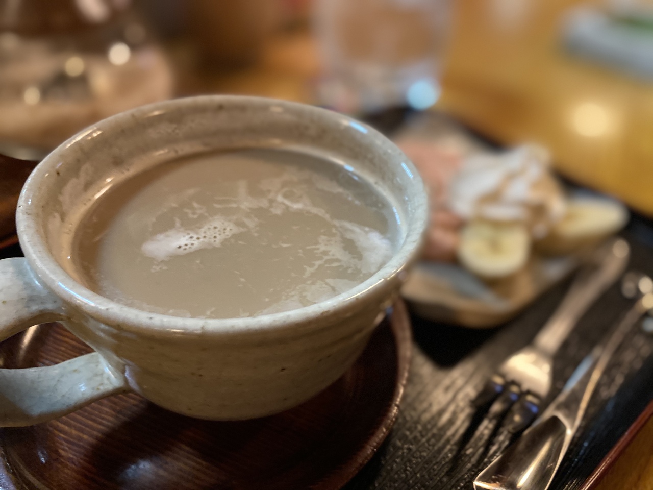 和のぬくもりを残す大きめカップにたっぷりのカフェオレ。