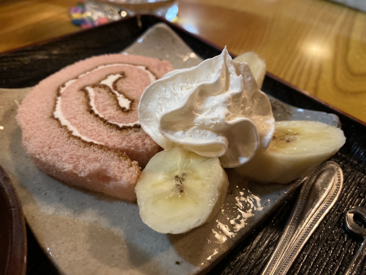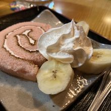 ドリンクだけかと思っていたが、小さなロールケーキとバナナ、生クリームをトッピングされた洋菓子付きと言う嬉しいサービス。
