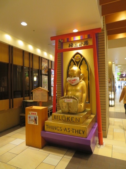こちらは名前の通りに、桜橋出口から出て横断歩道を渡ったところにあり、通路になっています。その両側に飲食店が並んでいて、どこもリーズナブルです。中央あたりに座っているビリケンさんは2020年の夏ということでマスクをしていました。暗い気持ちになりますね。
