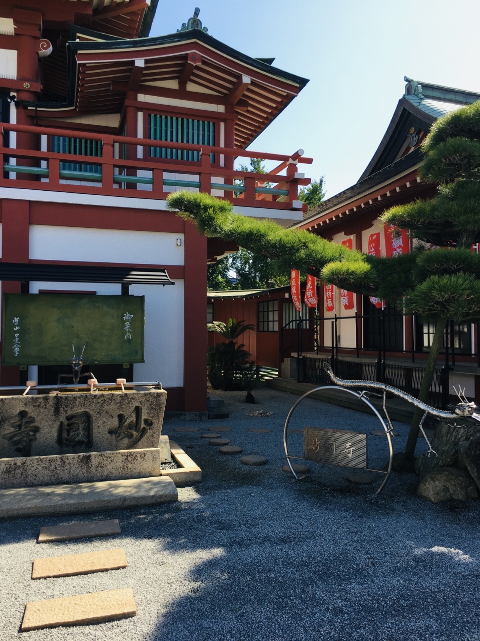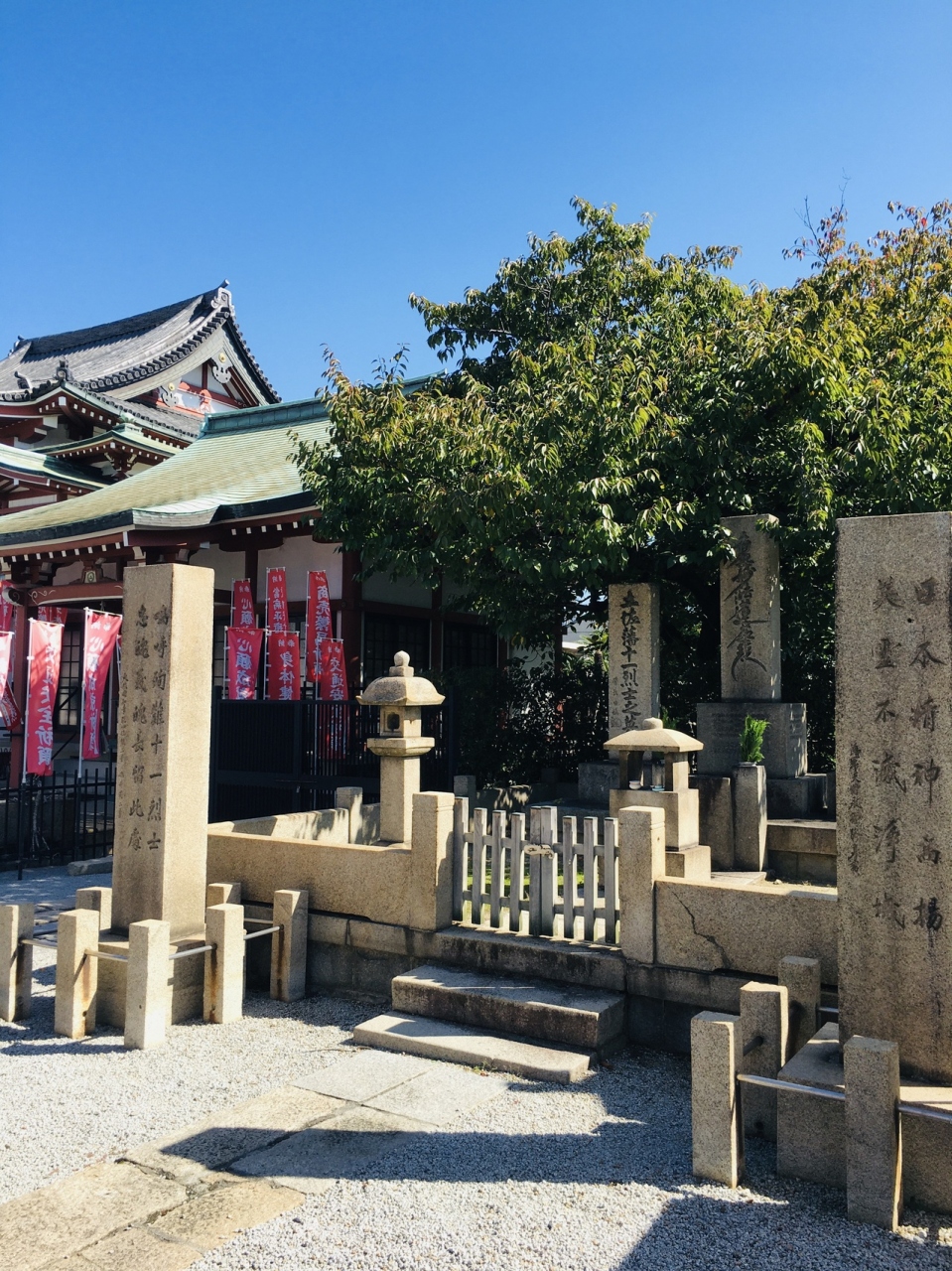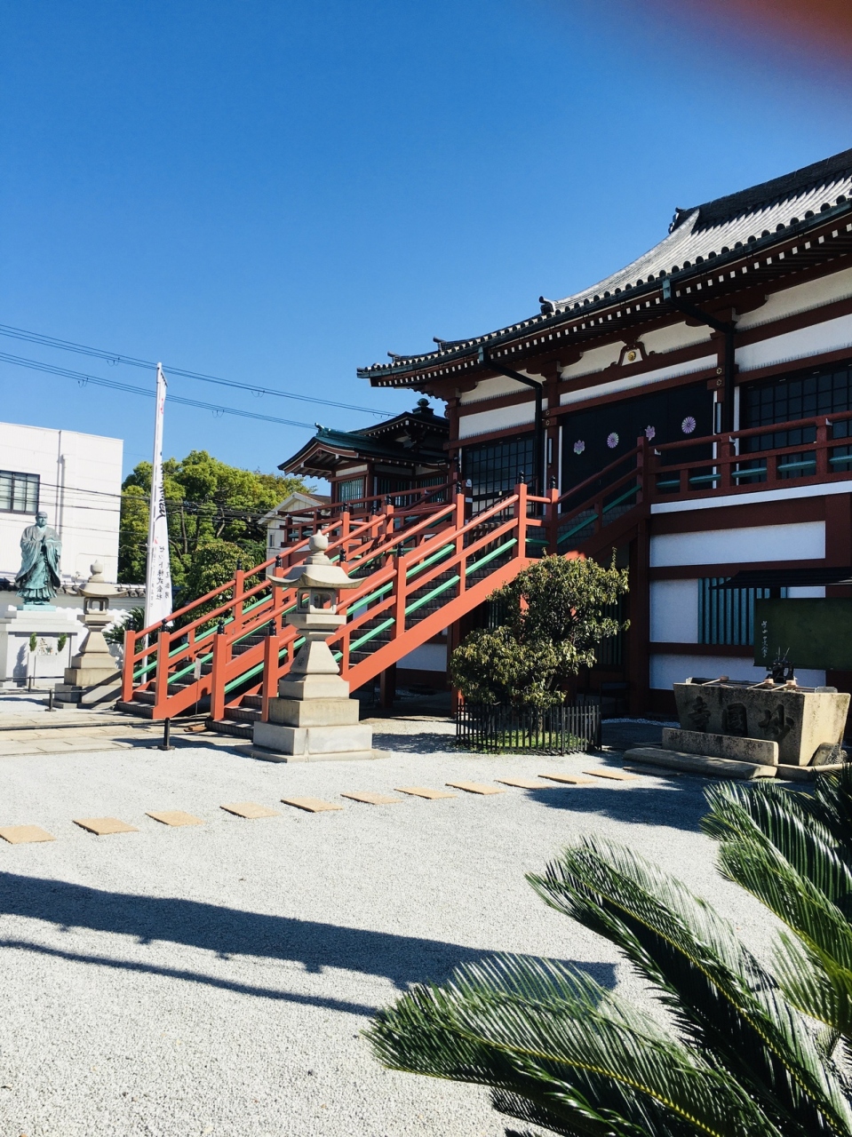 幕末にフランス兵との間で起った堺事件の地で土佐藩士11人上切腹した地でもあり、本能寺の変時、徳川家康が寄宿した寺でもあります。境内は小粒の砂が巻かれ松が見事でした。赤い色の建物が多く、蘇鉄がいくつかあるので南国風の感じでした。
