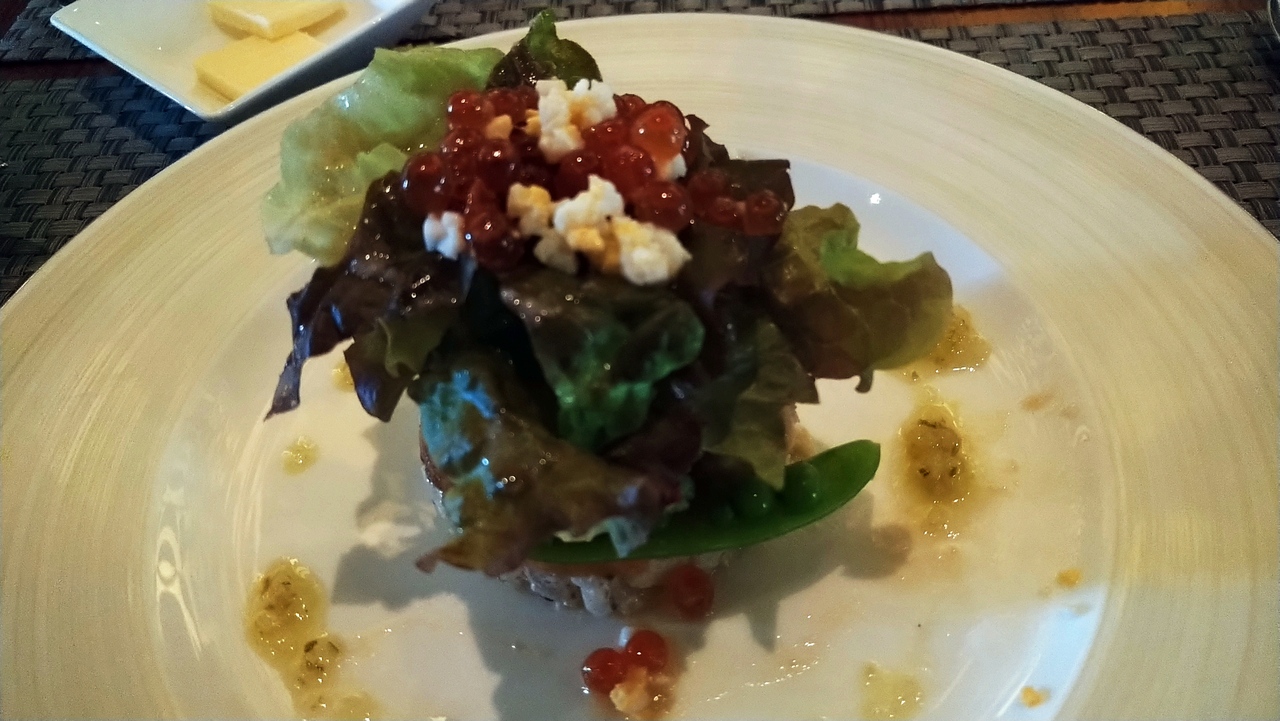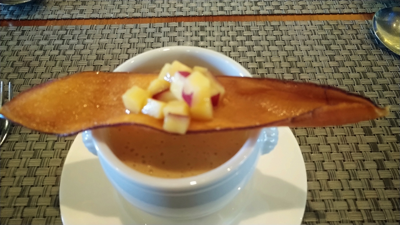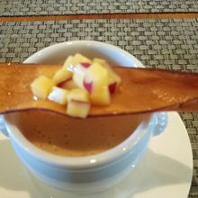 オードブル、スープ、メイン(魚)、コーヒー、小菓子、サービスのソルベ、おかわり出来るパン。