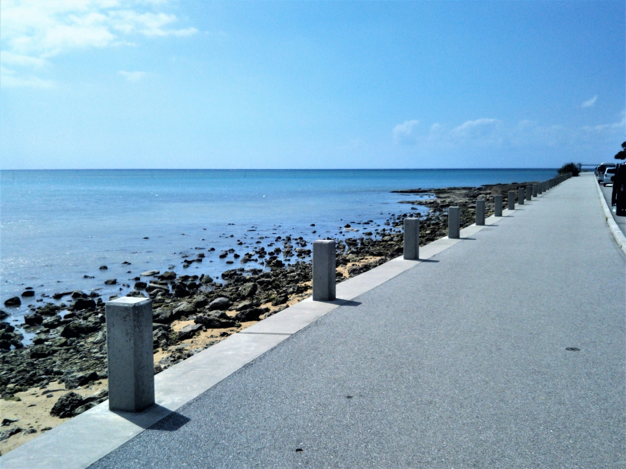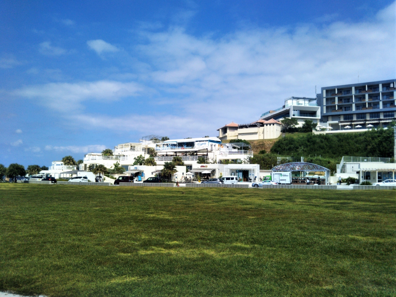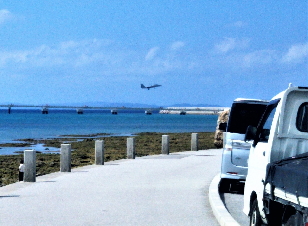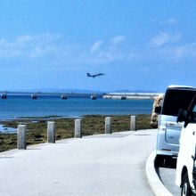 那覇空港の南端と豊見城からの道路("瀬長島海中道路")で結ばれているので市内からも簡単に行き来できます。きれいな海と白亜のウミカジテラスのコントラスト、空港を離発着する飛行機を眺められます。当日は訓練なのか、自衛隊戦闘機が頻繁に離発着を繰り返していて、バックカバーを開き少しフレアを掛けながらの着陸態勢が目の前で見ることができました。