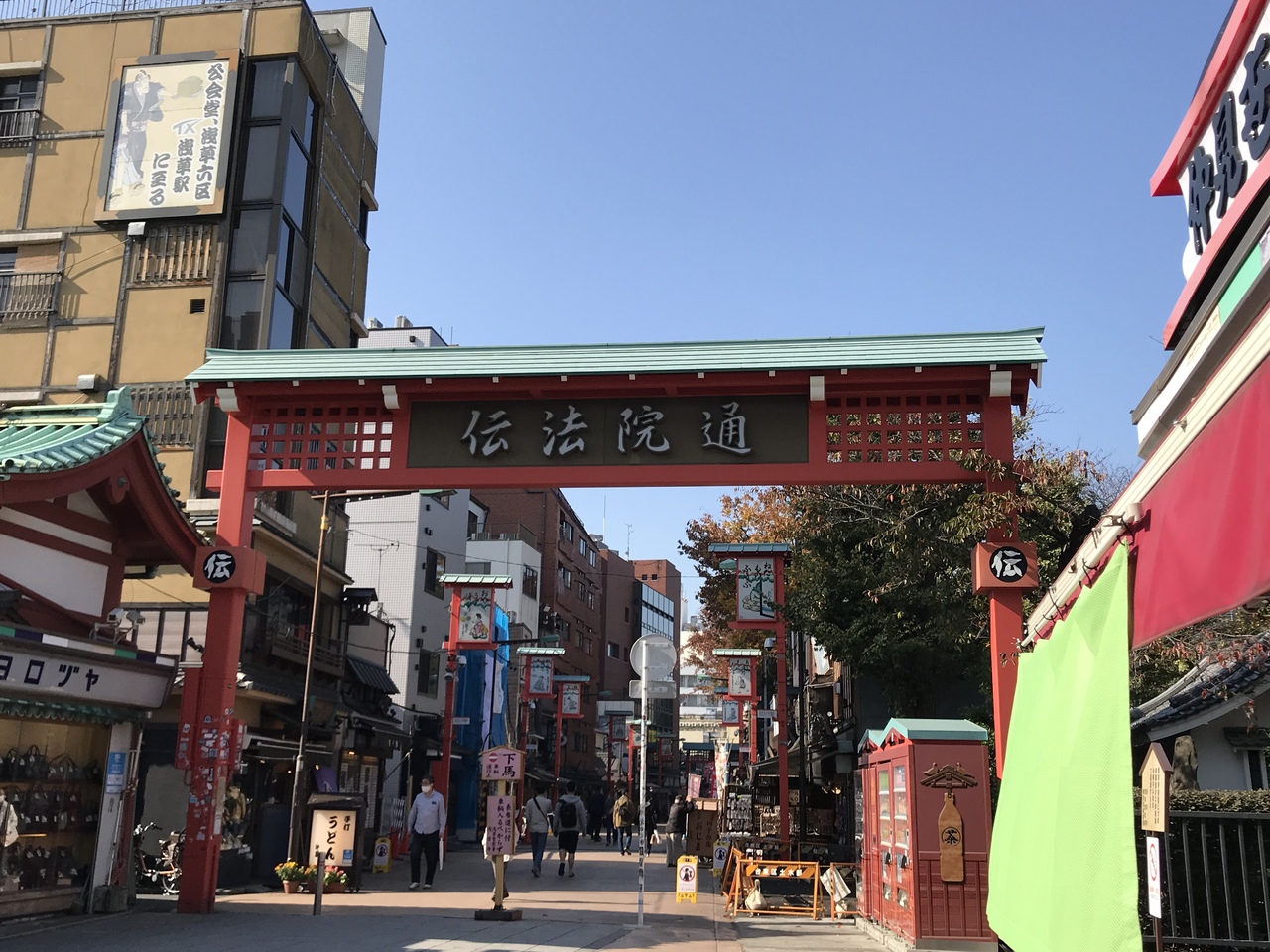 すみだリバーウォークから浅草寺方面に向かって歩いている時に、遠くからでも目立つ朱塗りの門が目に入りました。近づいてみると伝法院通と書いてあり、江戸切子や櫛の専門店など魅力的なお店が数多くありました。平日の午前中だというのに思っていたよりも観光客が多く、外国語があちこちから聞こえてきました。