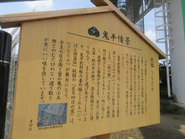 東京にある橋の一つです。隅田川と北十間川の合流地点にある橋です。長さは長くなく、ちょっとこじんまりとしています。スカイツリーがよく見える場所なので、写真を撮るにはいい場所かも。橋には看板があって、「鬼平犯科帳」の文字が。この場所の登場シーンについて詳しく書かれていました。