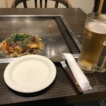 お好み焼き看板メニューらしい岡家焼きに牡蠣をトッピング。