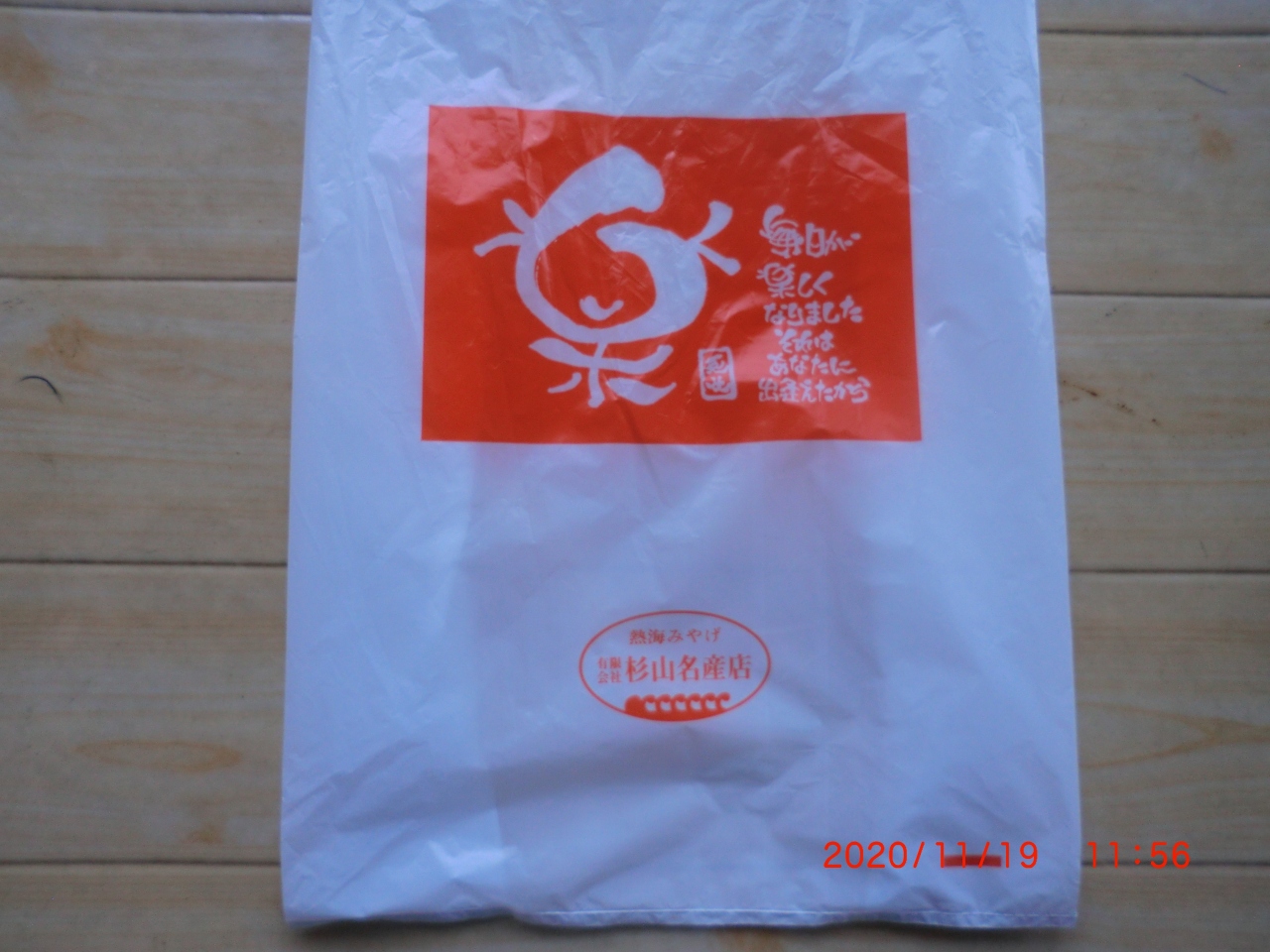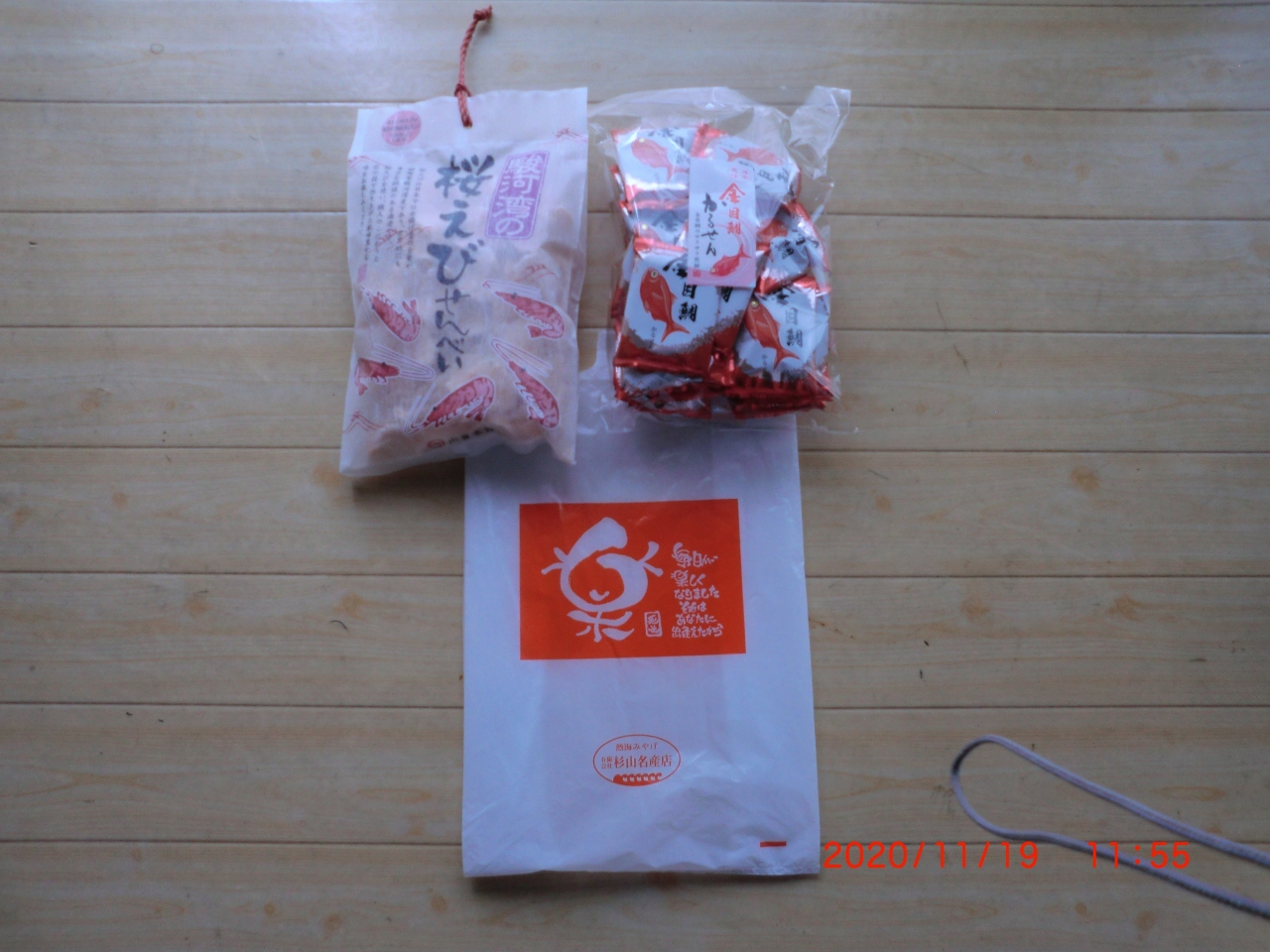 友人達と熱海温泉で忘年会=GOTOトラベルに行き「地域共通クーポン」を貰ったので商店街で物色してましたが「生もの」や「干物」や「焼き立て」などの店がありましたが買って帰るには袋詰めのお菓子類がいいと思ってました。「杉山名産店」さんの店先に「駿河湾のえびせん」=袋詰めがあり買いました。名産品なのかは分かりませんが友人たちに配るにはいいかと買いました。