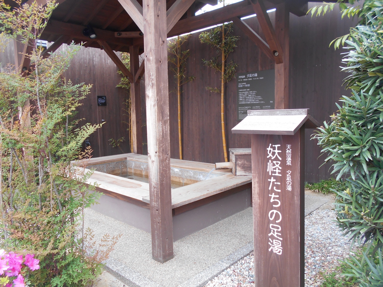 境港駅前にある夕凪の湯「御宿野乃の足湯ですが、宿泊客でなくても無料で入ることができます。利用時間は、6:00~19:00です。天然温泉ですから、水木しげるロードを散策した疲れた足を癒すにはちょうど良い施設です。名前は妖怪たちの足湯ですが、人間も入浴できます。