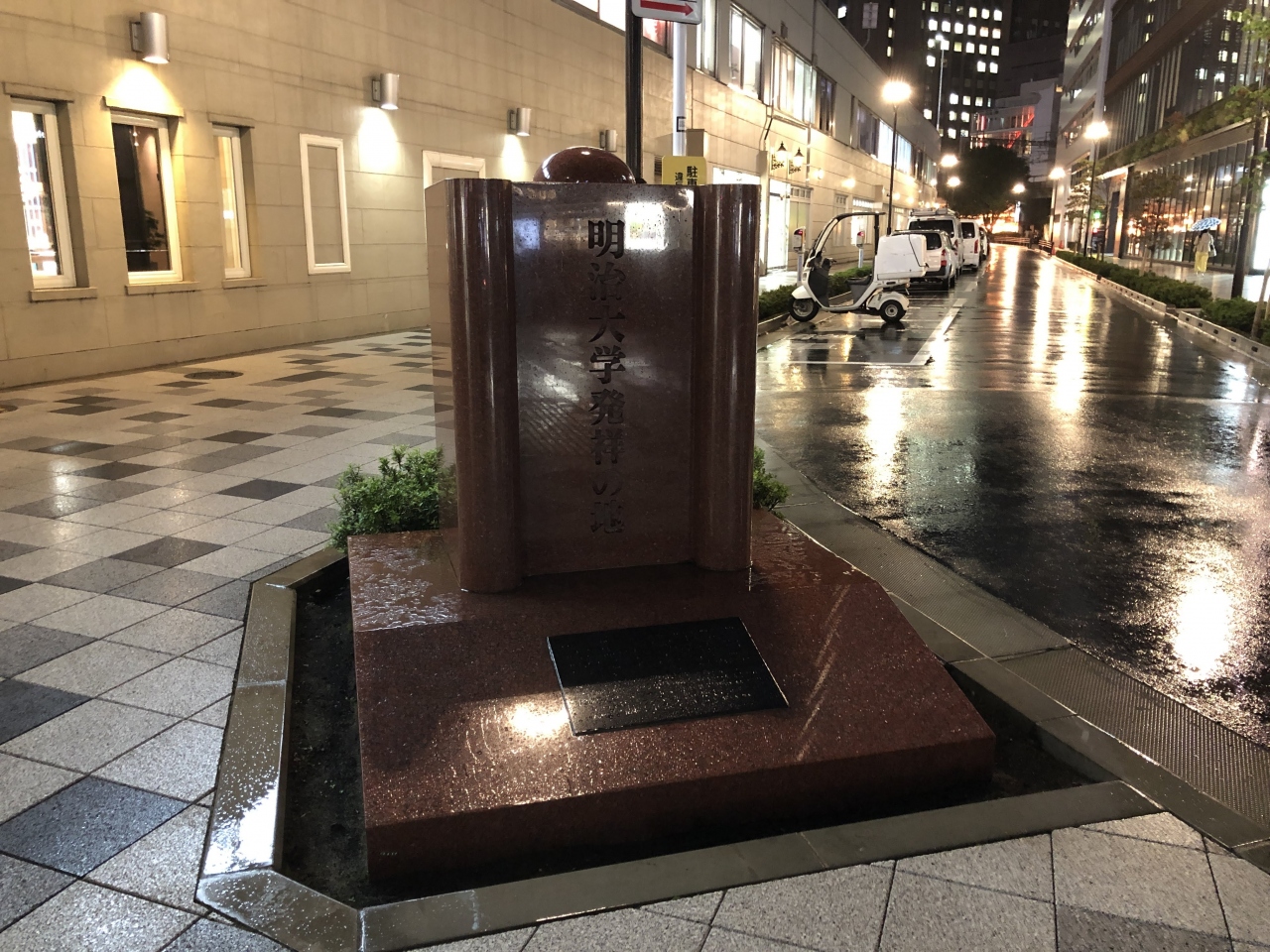 JR有楽町駅の近くにあります。今は記念碑と説明板だけがあるぐらいですが、明治大学の前身の学校が開校した場所とのことでした。今のこのあたりの風景と明治大学というのはイメージが結びつきませんでしたが、ここに来て新しいことを知る機会ができ、いい勉強になりました。