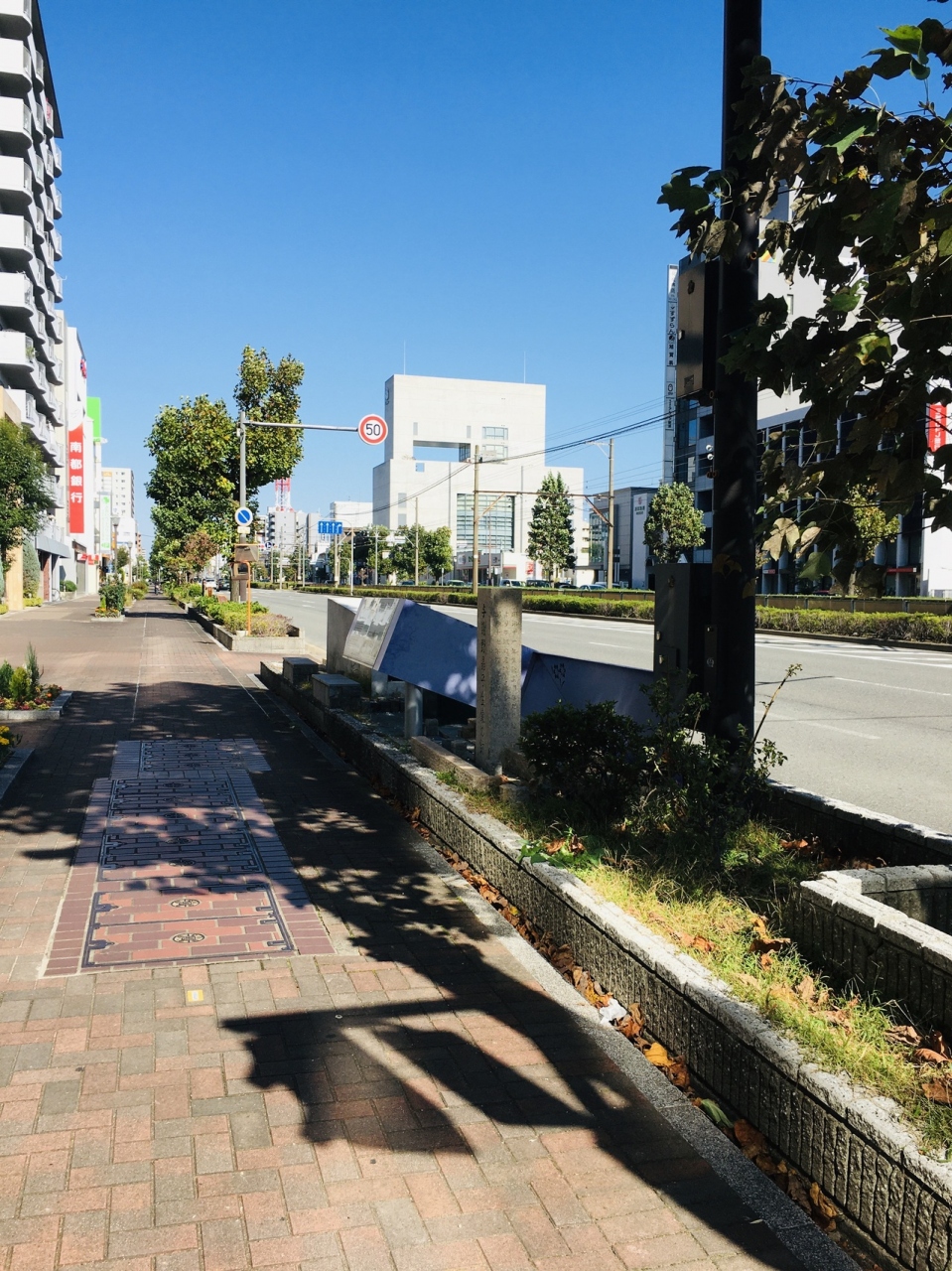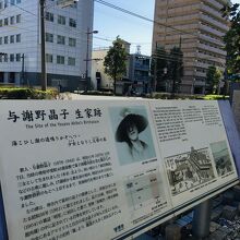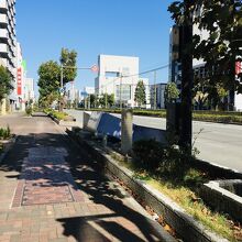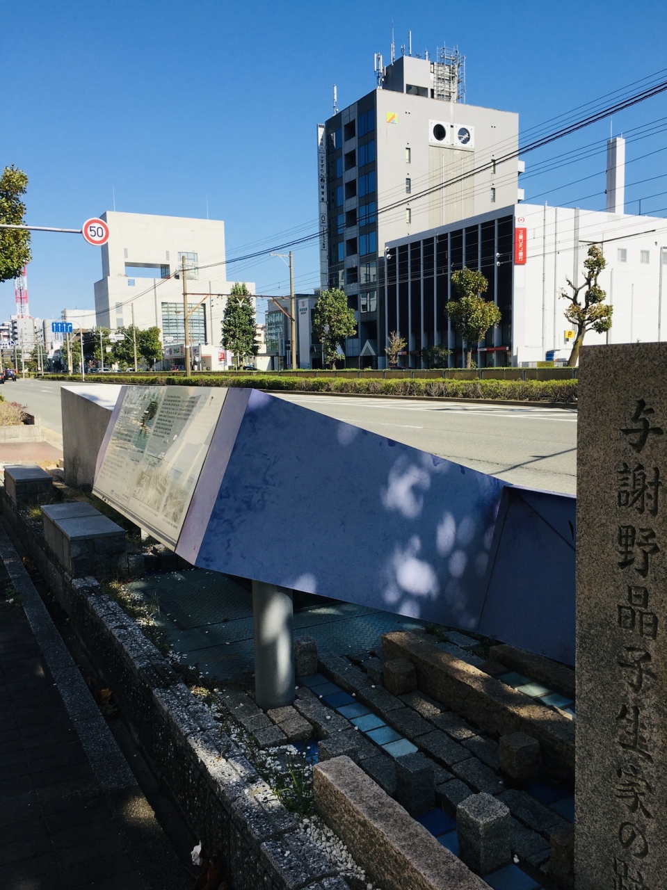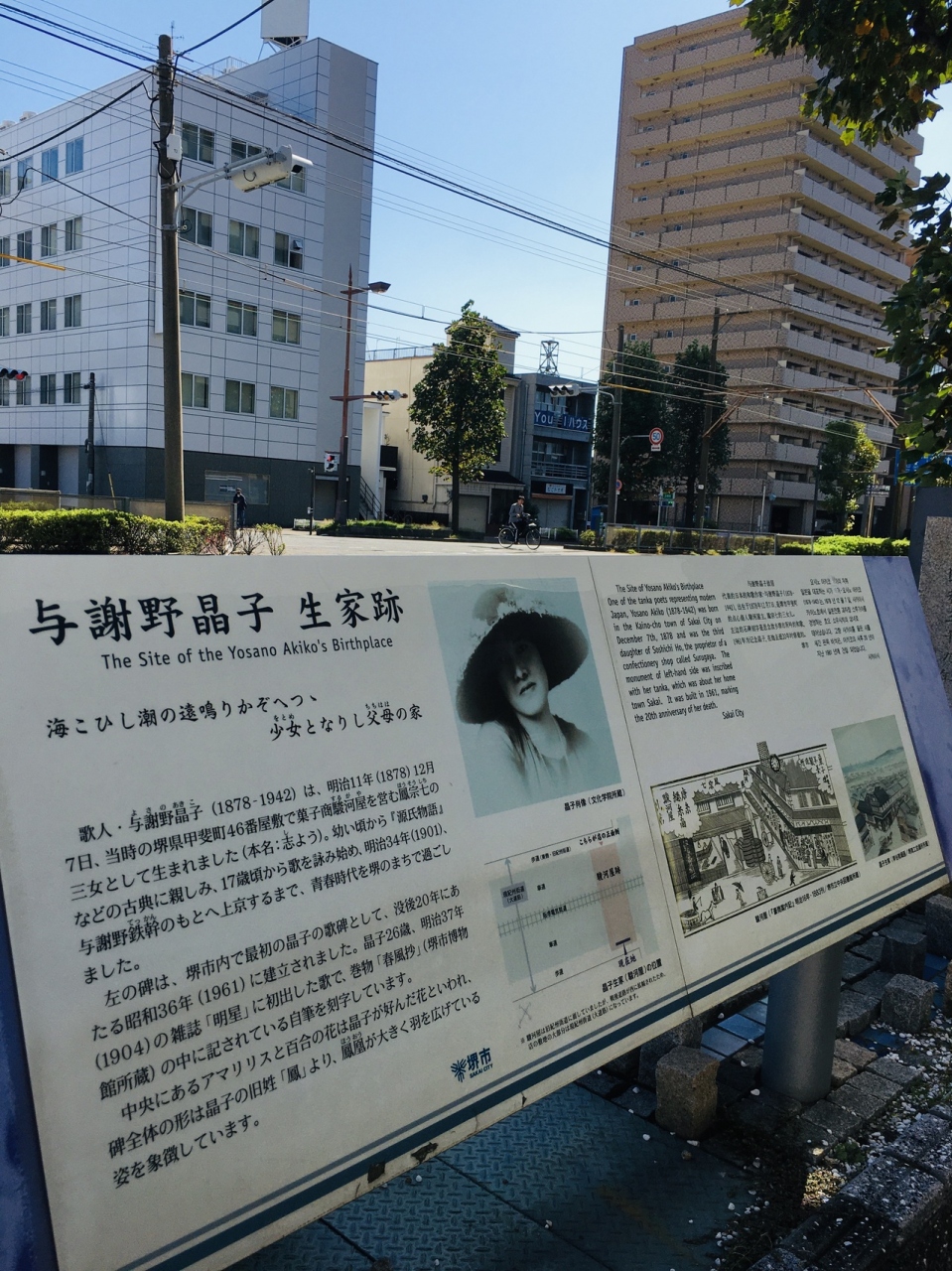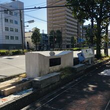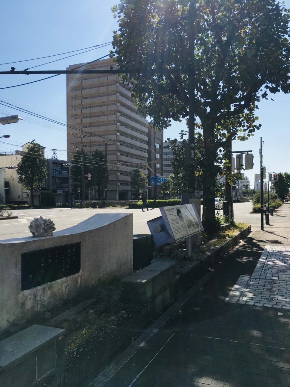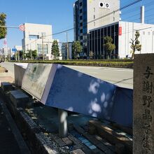 大通り沿いの歩道には石碑があり説明看板も大きく詳しい文章でした。駿河屋というお菓子屋だったようで当時は現在の阪堺電車の線路を跨いです家が建っていたようです。横長の石碑もあり歌碑が書いてありました。目立つ石碑でした。