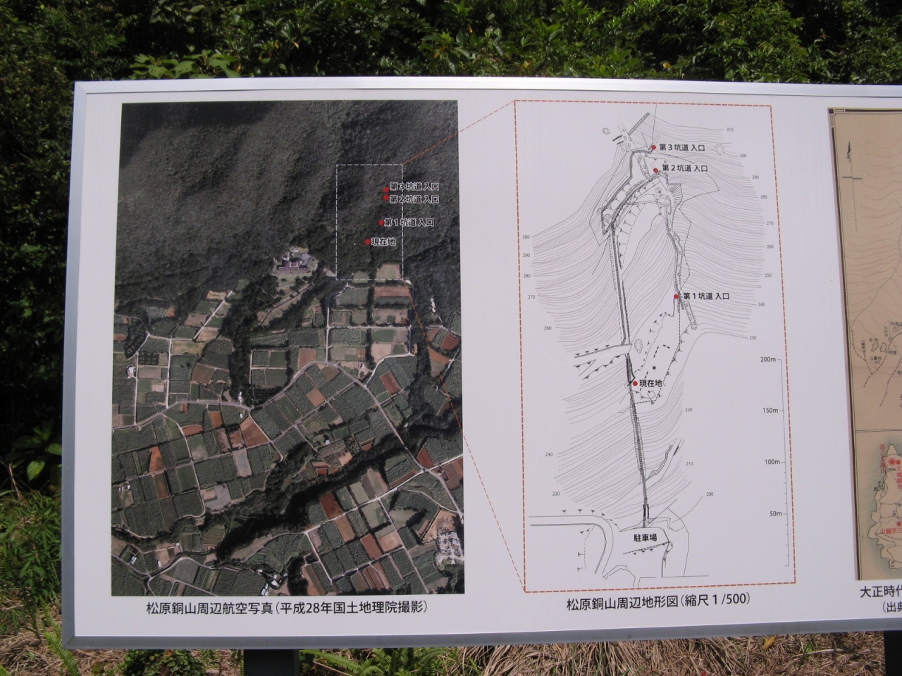 現地にある説明板(添付写真参照)によると、松原銅山は明治37年(1904年)ごろに発見、鉱山開発により大変賑わった後、昭和3年(1928年)に閉山されたとあります。