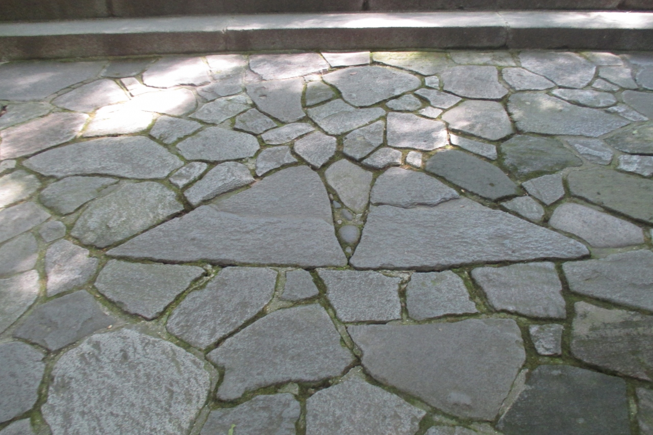 だらだらと続く階段に、普段の運動不足を感じてきたころ、参道の真ん中に「夫婦石」と呼ばれる三角形の石が2つ寄り添うように並んでいます。この辺りの石畳は敷いた人の技なのでしょう、きれいに組み合わされて敷かれています。そんな中に、この夫婦石が浮き出ている様に感じさせます。カップルは手を繋いで一緒に片足で、独身は両足で2つの石を踏むと御利益があるかも知れません。